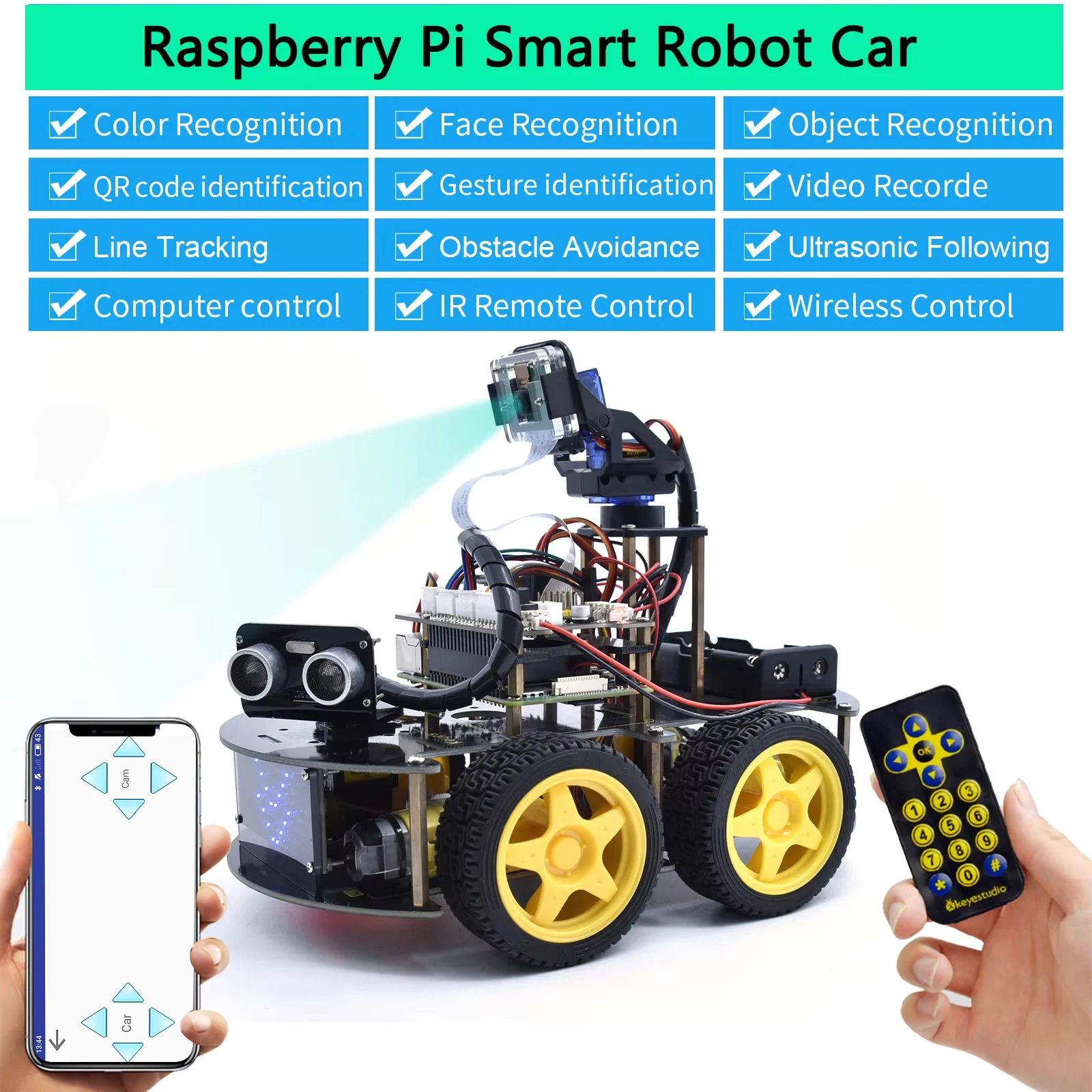 Keyestudio 4WD Smart Robot Car Kit For Raspberry Pi With Megapixels Camera Module and Programming Tutorials( No RPI 4B Board)