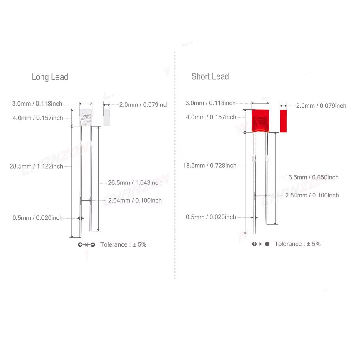 Forward Voltage: 2.0-2.2V (Red / Yellow / Orange) | 3V-3.2V (White / Green / Blue)