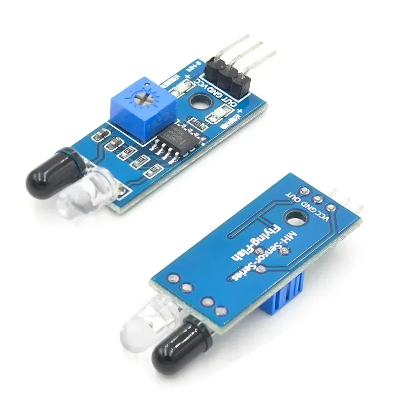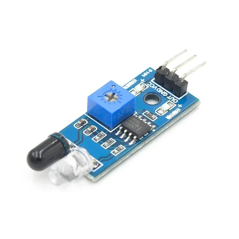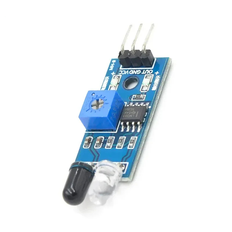The sensor module adaptable to ambient light, having a pair of infrared emitting and receiving tubes, transmitting tubes emit infrared certain frequency, when the direction of an obstacle is detected (reflection surface), the infrared reflected is received by the reception tube, After a comparator circuit processing, the green light is on, but the signal output interface output digital signal (a low-level signal), you can adjust the detection distance knob potentiometer, the effective distance range of 2 ~ 30cm, the working voltage of 3.3V- 5V. Detection range of the sensor can be obtained by adjusting potentiometer, with little interference, easy to assemble, easy to use features, can be widely used in robot obstacle avoidance, avoidance car, line count, and black and white line tracking and many other occasions.