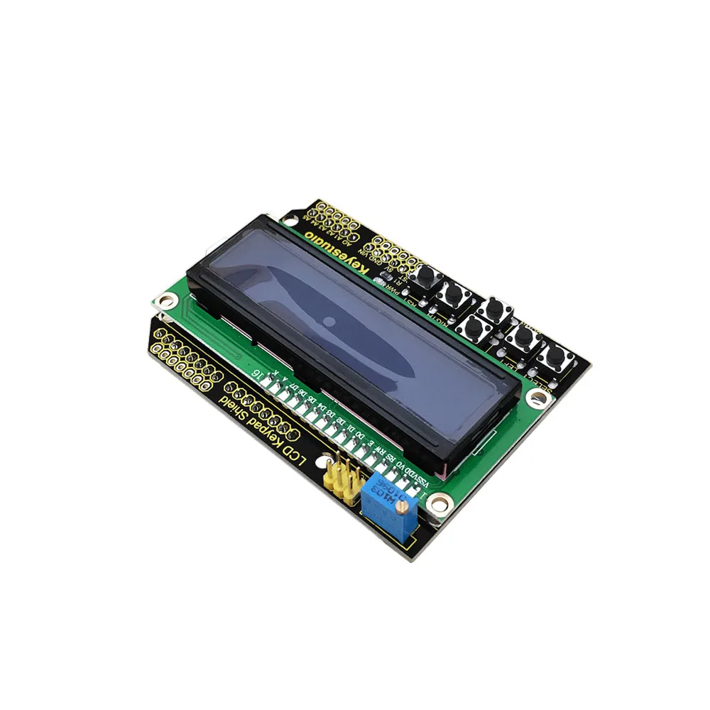 Keyestudio LCD1602 expansion shield integrates 1602 LCD display and six buttons into one piece, which is fully compatible with keyestudio UNO R3 control board. It can work just through stacking expansion board on the keyestudio UNO R3 control board, which is very easy and convenient.