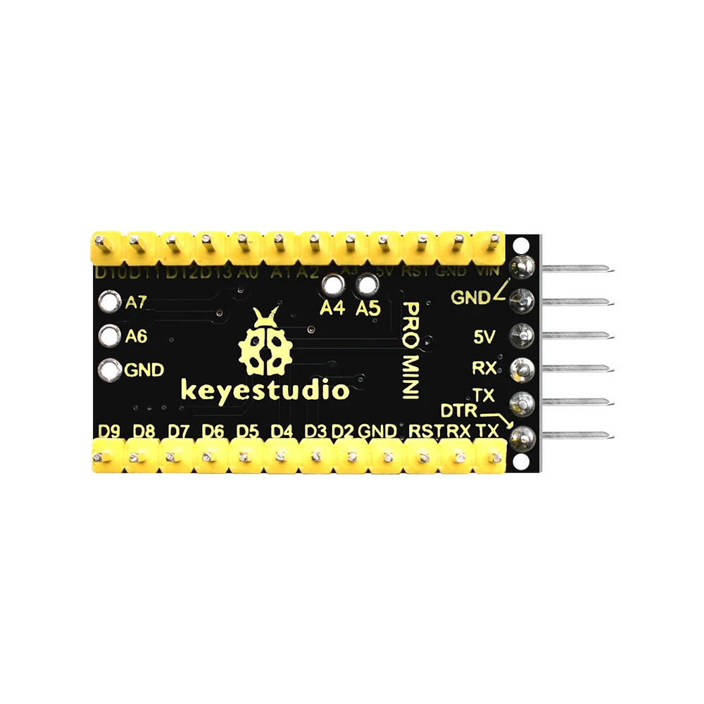 The keyestudio pro mini can be powered via the pins 5V GND (DC 5V), or female headers Vin GND (DC 7-9V).