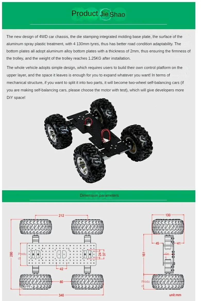 The new design of 4WD car chassis, mold stamping integrated molding bottom plate, the surface of the aluminum spray treatment, with 4 130MM Bigfoot tires, so as to have better road conditions adaptability. The bottom plate is made of aluminum alloy with 2mm thickness, which ensures the robustness of the car, and the weight of the car reaches 1.25KG after installation. The vehicle uses a simple design, which requires users to build their own control platform on the upper level, and it leaves room for you to expand anything you want! Mechanically, if you want to split it in two, it will become two two-wheeled self-balancing cars (if you do self-balancing cars, please choose a motor with a test), which will give developers more room for DiY!