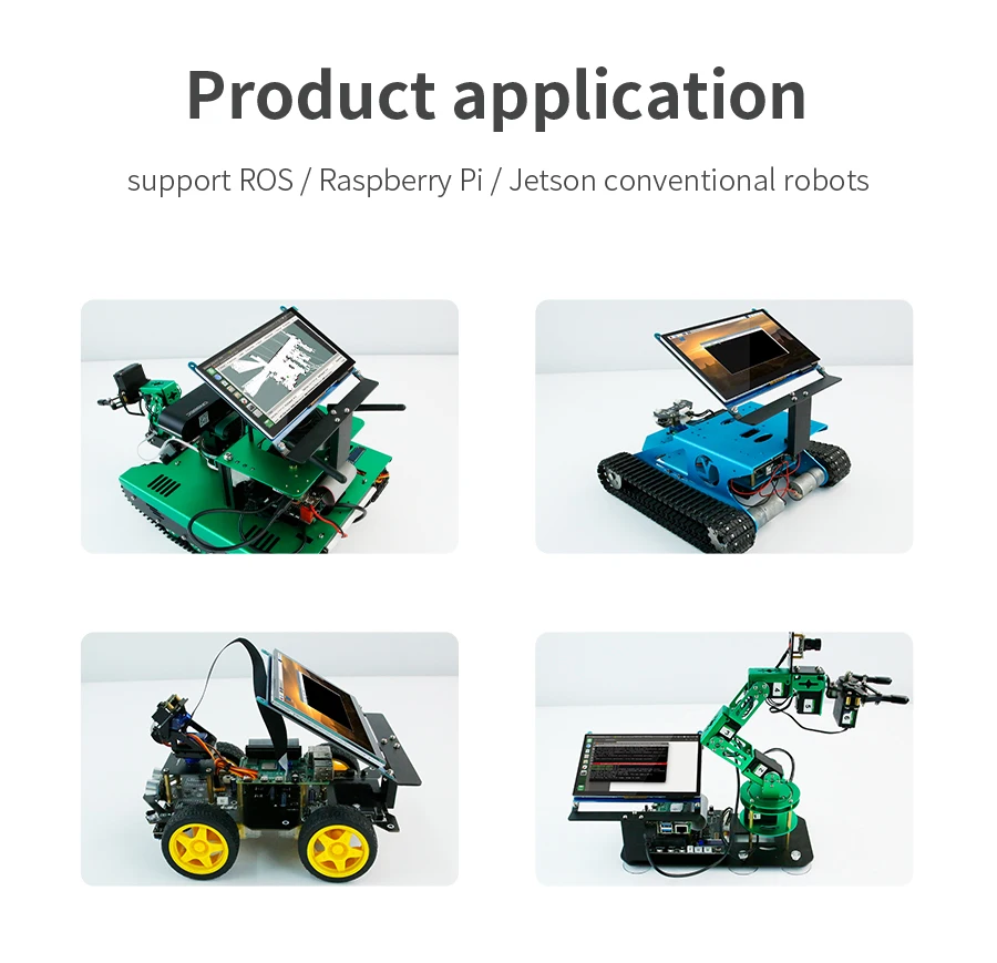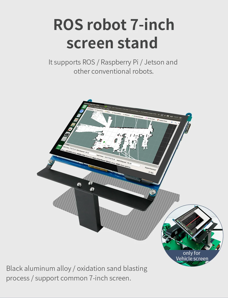 This bracket is perfectly compatible with 7-inch display screen. It is made of aluminum alloy, oxidized sandblasting process, beautiful and durable. Only need some screws can be used to fix it on the AI robot, smart car or other console. With it, you can control the robot operating system at any time without a PC.