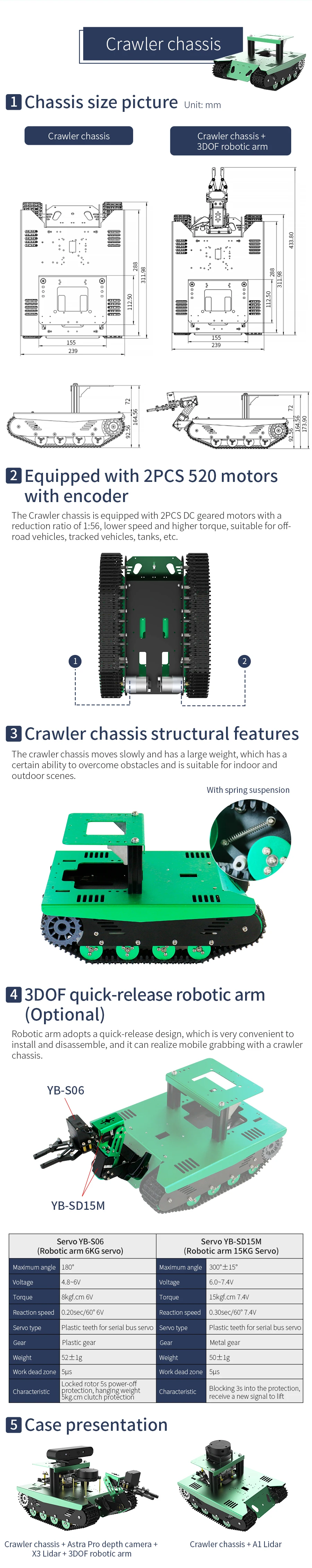 Crawler chassis: Large size high-quality crawlers and motor with encoder(1:56) can be used to realize cross-country with complex terrain.