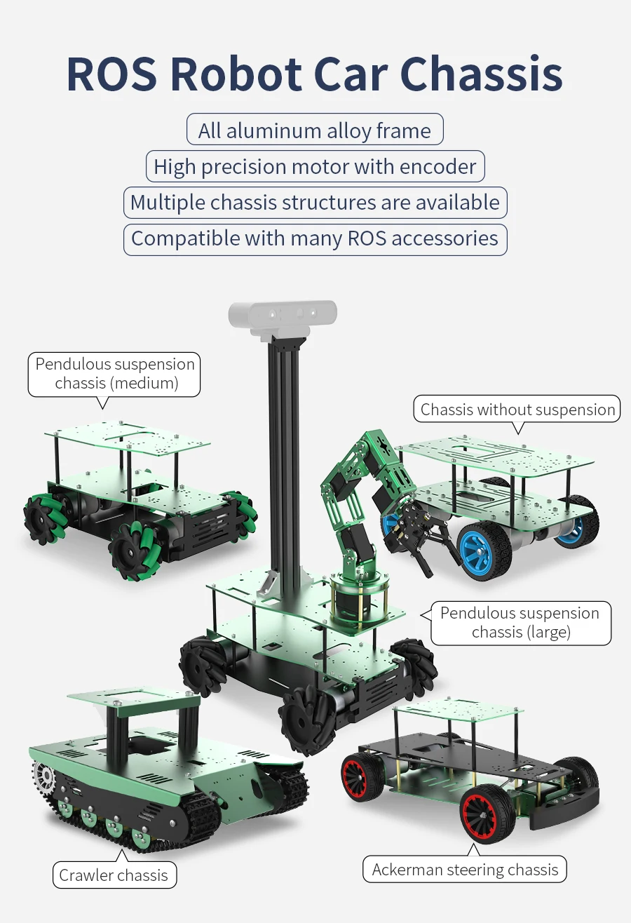 We have a total of 9 robot chassis for choice. They are made of green aluminum alloy, beautiful and durable. Equipped with 520 motor with encoder, which provides a strong power for the car. Each aluminum alloy accessory is designed with screw copper column holes with reasonable spacing. Users can install main control board, lidar, camera, display screen and other equipment by themselves. We provide 3D model files of each chassis for free, and users can use them for their own projects.