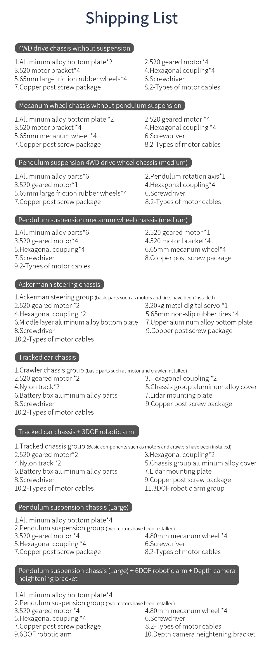 We have a total of 9 robot chassis for choice. They are made of green aluminum alloy, beautiful and durable. Equipped with 520 motor with encoder, which provides a strong power for the car. Each aluminum alloy accessory is designed with screw copper column holes with reasonable spacing. Users can install main control board, lidar, camera, display screen and other equipment by themselves. We provide 3D model files of each chassis for free, and users can use them for their own projects.