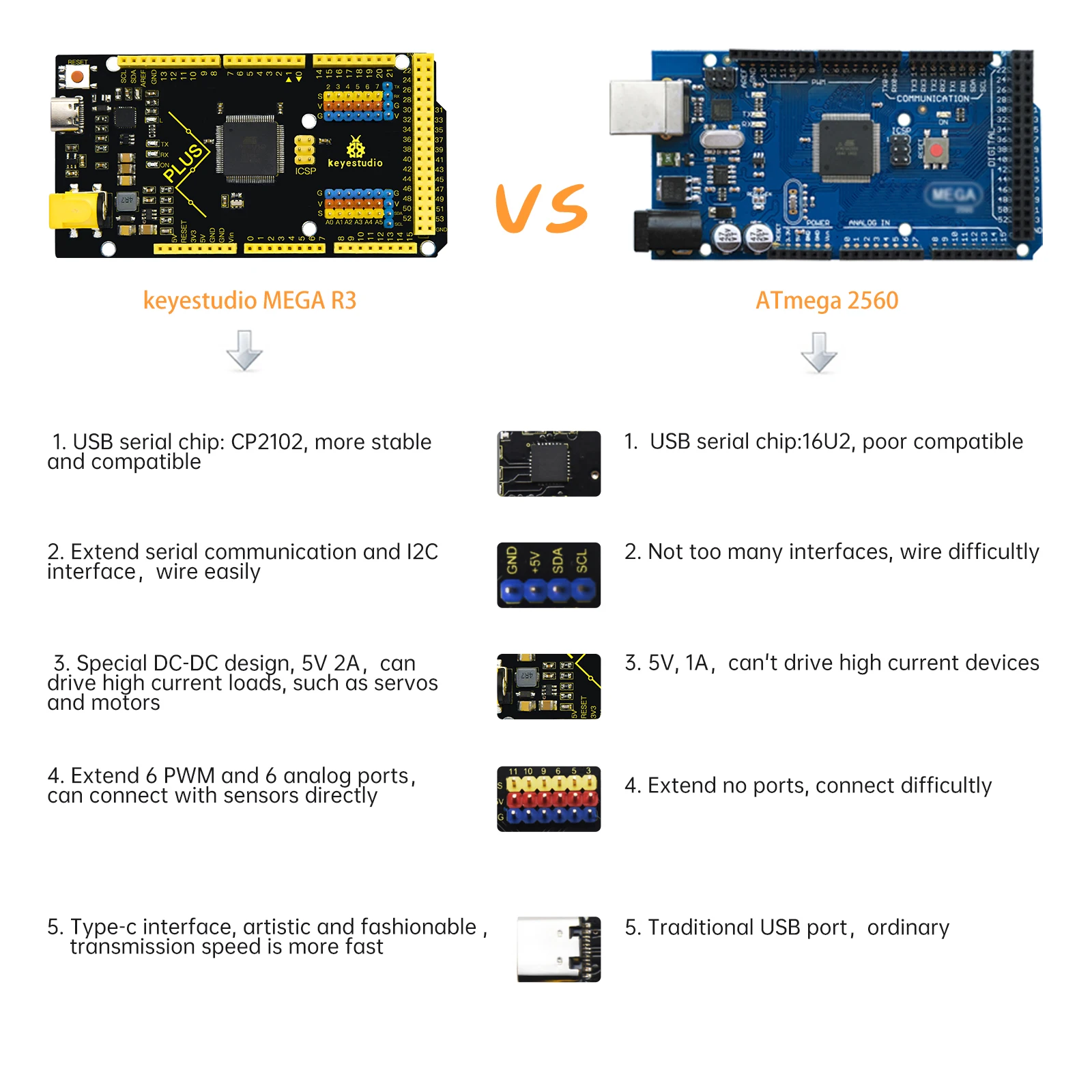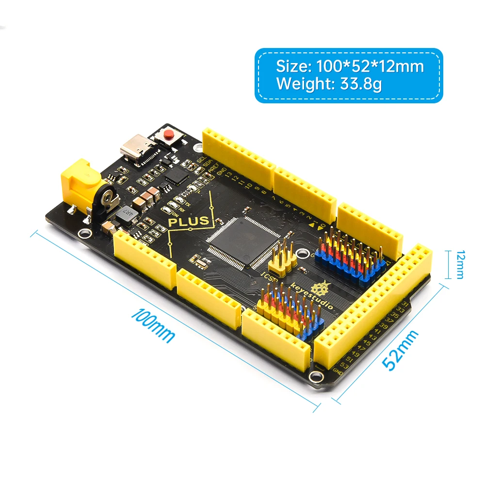 Mega 2560 plus Board, whose processor core is ATMEGA2560-16AU, is fully compatible with ARDUINO MEGA 2560 REV3. USB to TTL chip adopts more economic and stable CP2012. This plus board consists of 54-channel digital input and output ports, of which 15 pins are served as PWM output, 16 analog inputs, 4 serial communication ports, one 16MHz crystal oscillator, 1 USB port, 1 power socket, 1 ICSP interface and 1 reset button.