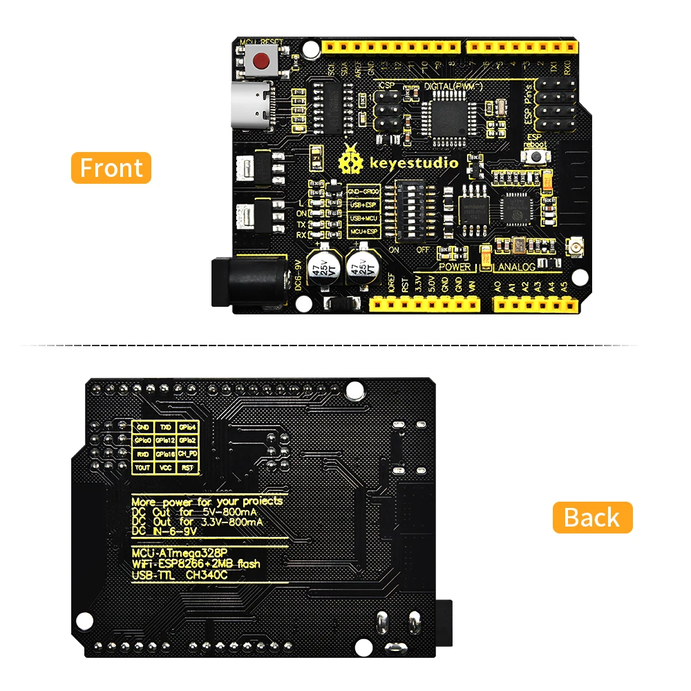 WIFI ATMEGA328 UNOPlus main control board adopts two MCU including ATMEGA328 and esp8266, containing all functions of Arduino unoR3 and ESP8266development board.