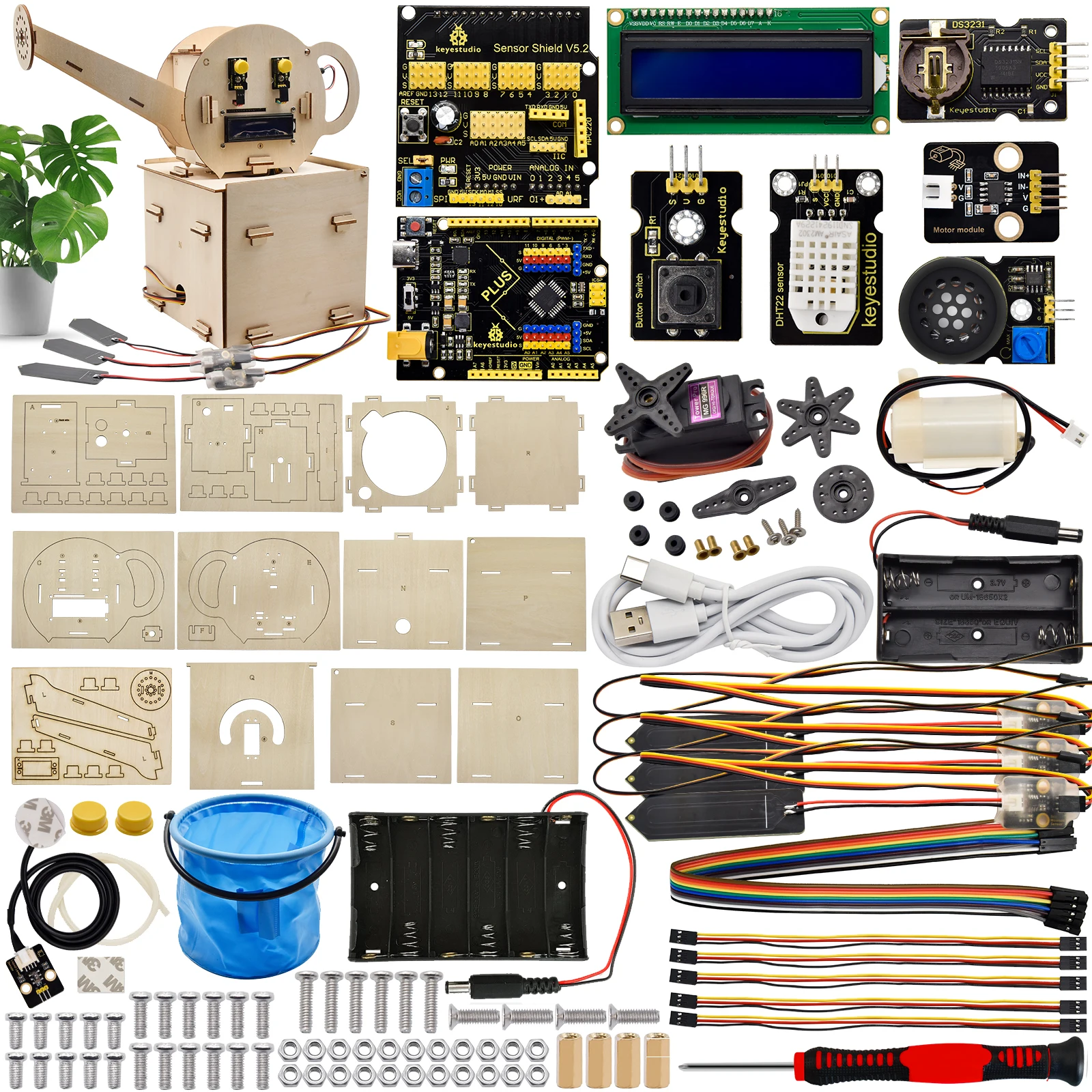 Keyestudio automatic watering device, an open resource programming kit, makes teenagers acquire the practical knowledge of electronics, machinery, control logic and computer science easily. It is easy to build by slot connection, wooden boards, plus thirteen projects from simple to complex. Furthermore, the kids’ hands-on ability and way of thinking will be greatly enhanced after building up their own watering device.