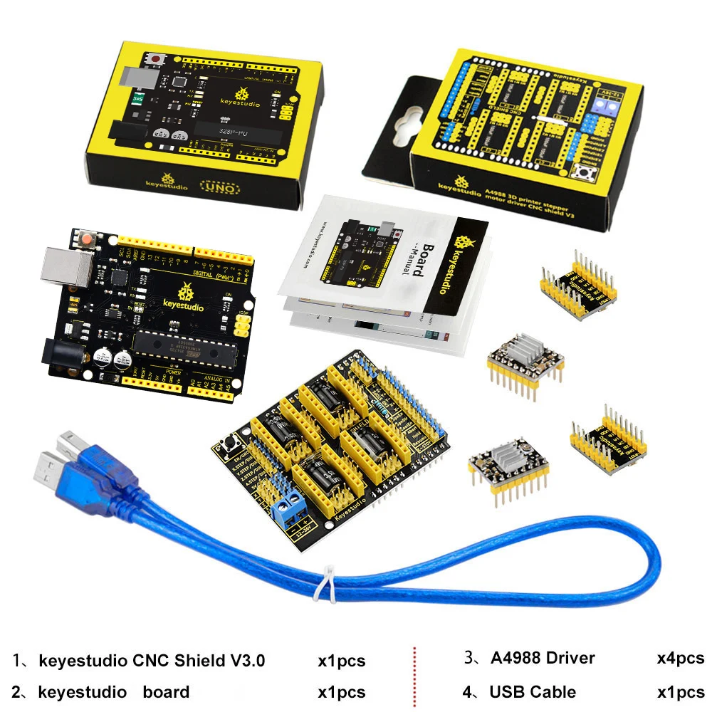 Keyestudio CNC Shield V3.0 can be used as driver expansion board for engraving machines. It has total 4 channel slots for DRV8825 stepper motor driver modules (not included) for driving 4 channel of stepper motors. Each channel of stepper motor only needs 2 IO ports, which means 6 IO ports is sufficient to manage 3 stepper motors. This shield can make quick work for managing stepper motors in your project.