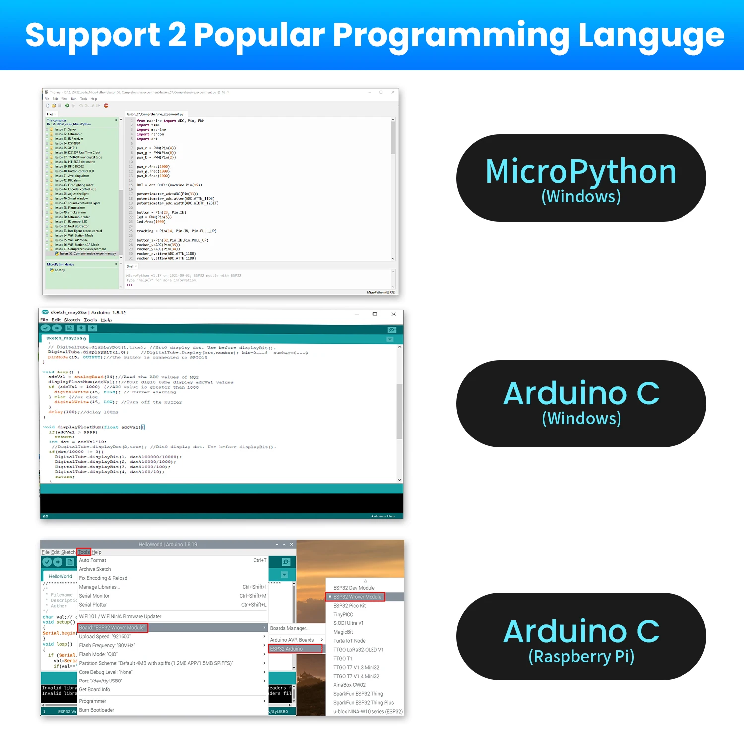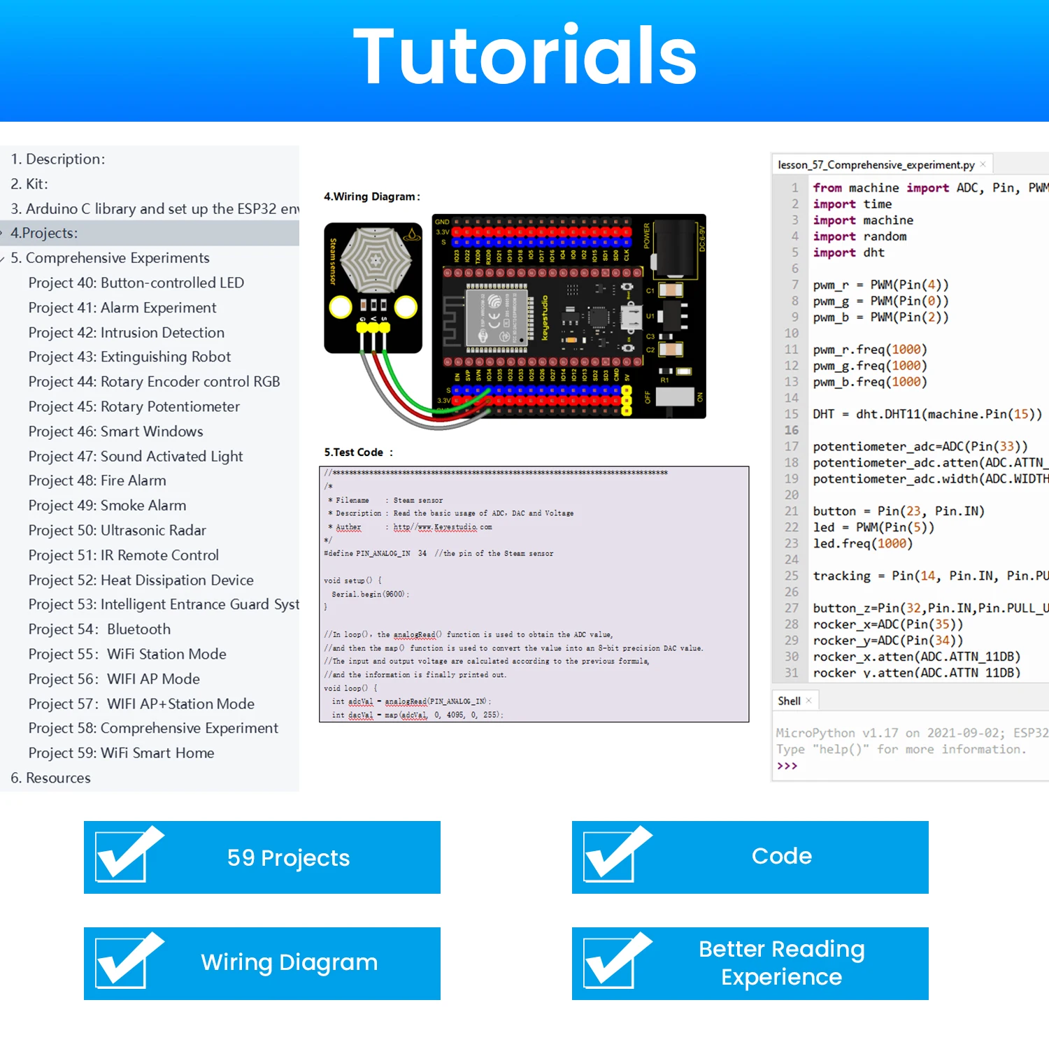 ESP32 37 in 1 sensor kit mainly contains 37 commonly used sensors and modules, an ESP32 board, an ESP32 expansion board and Dupont wires.