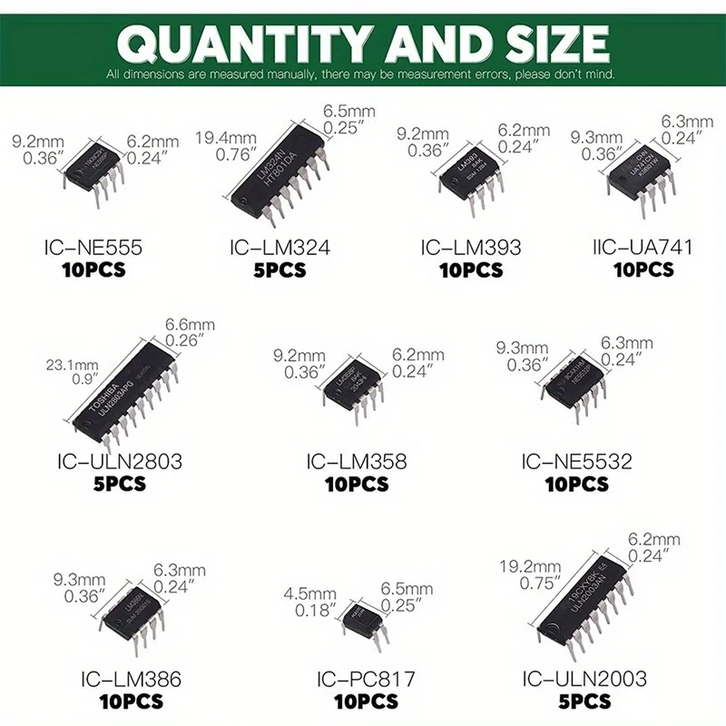 Color: Black Material: Plastic Packaging content: NE555 10PCS LM324 5PCS LM393 10PCS UA741 10PCS ULN2803 5PCS LM358 10PCS LM386 10PCS NE5532 10PCS ULN2003 5PCS PC817 10PCS