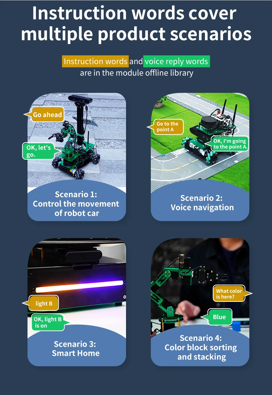 Built-in 85 voice commands commonly used by the programming car can be accurately recognized.There are many commands and they cover most of the usage scenarios, and there is no need to write additional command statements for the voice module.