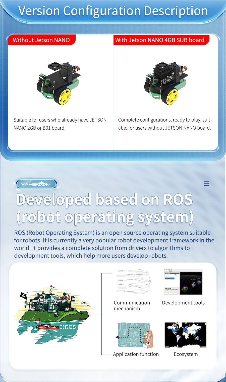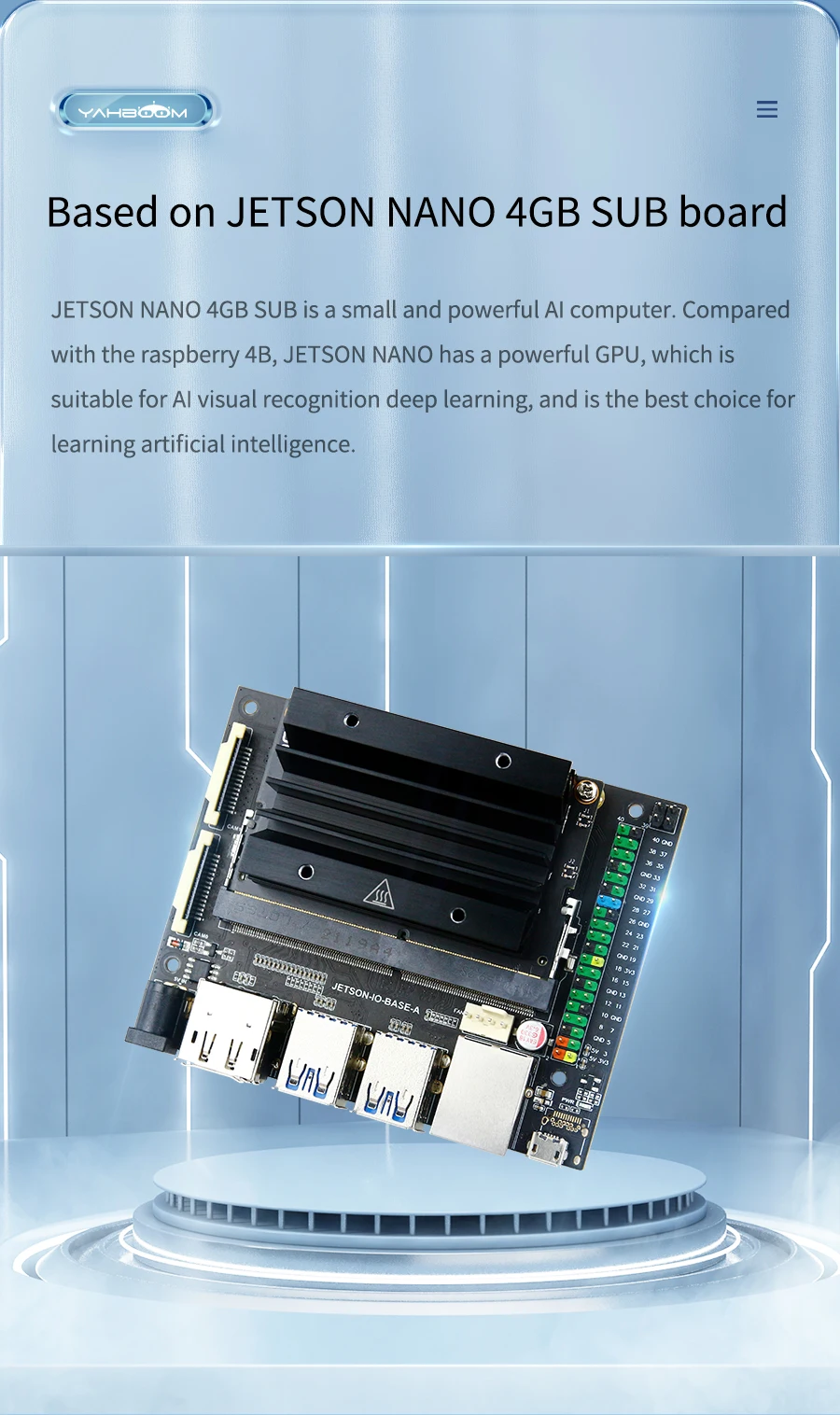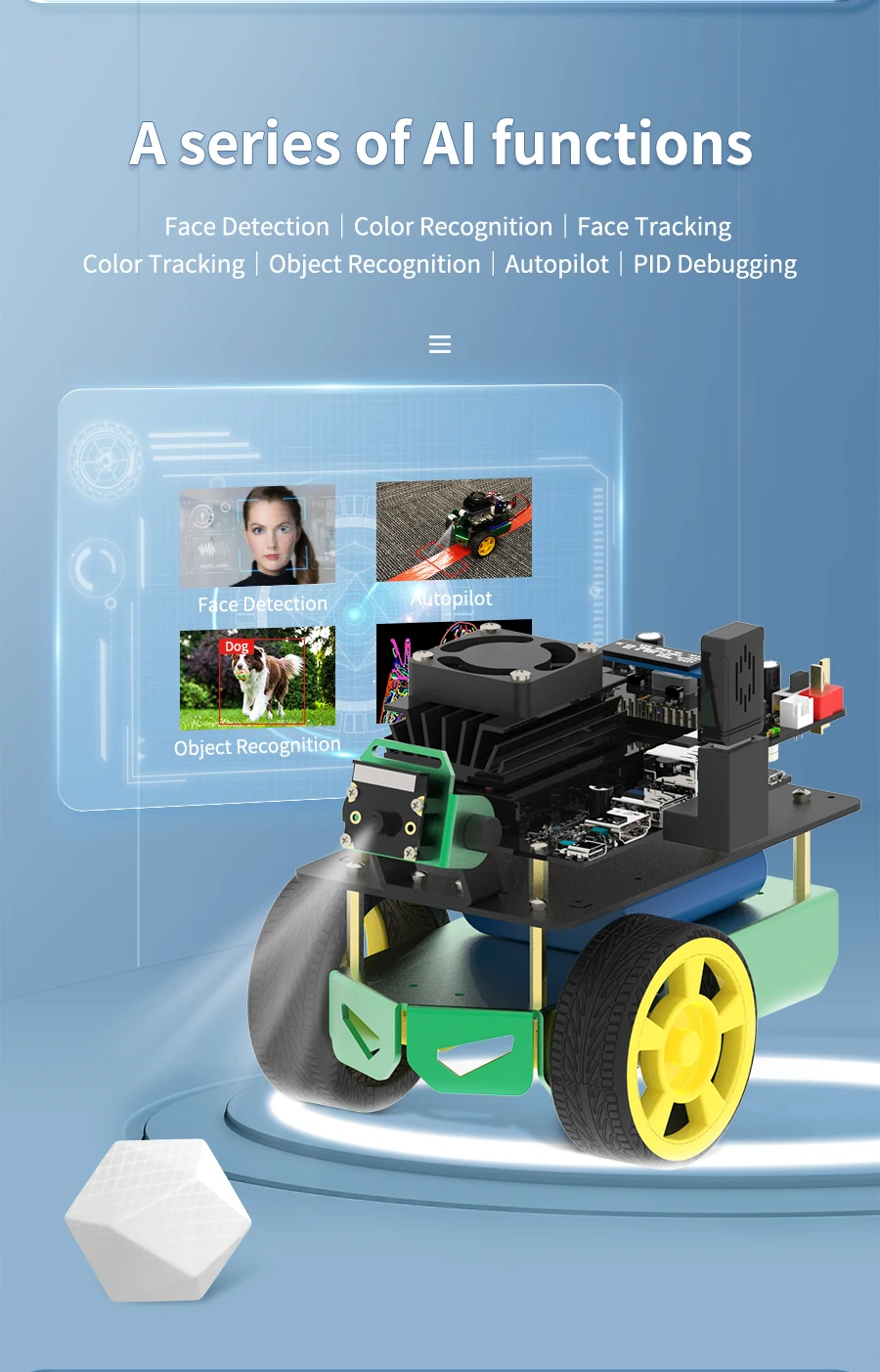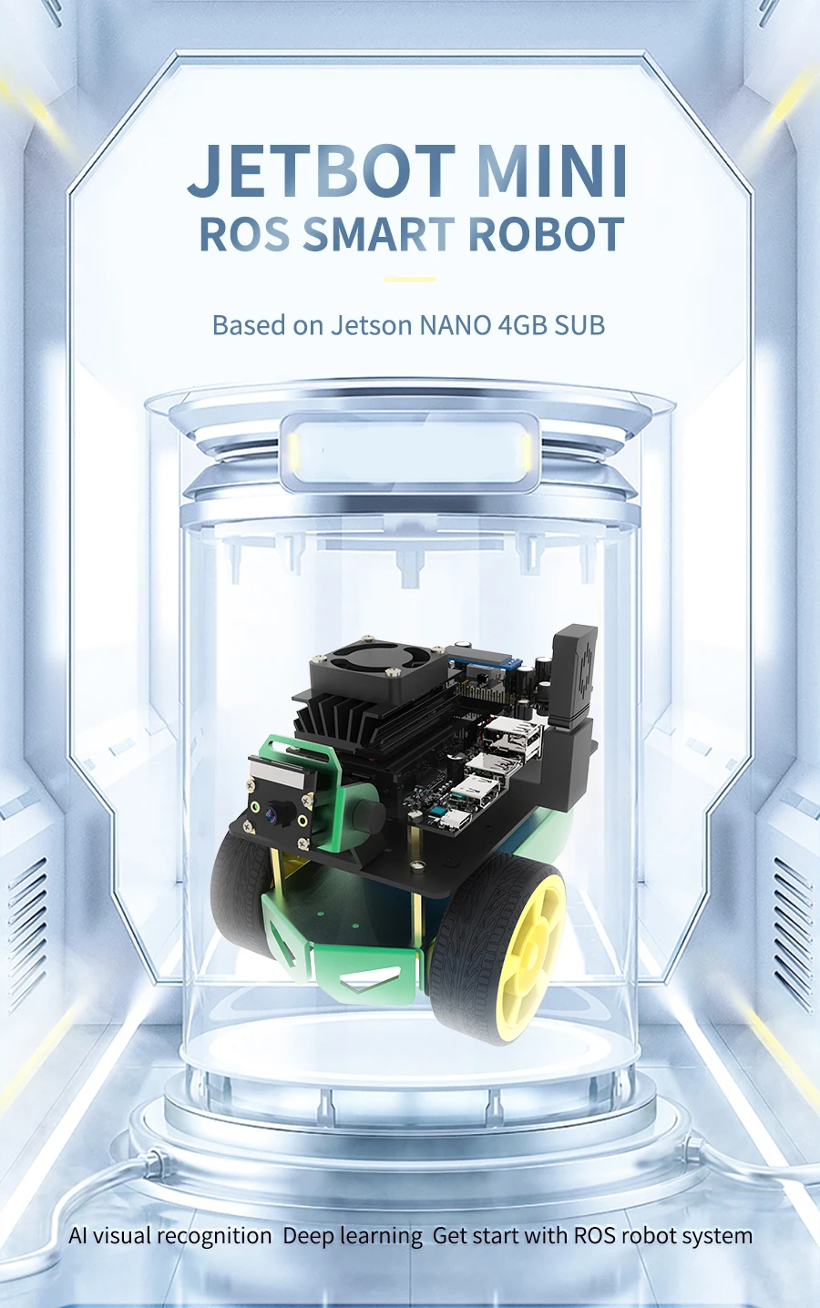 JETBOT MINI is a ROS artificial intelligence robot based on the NVIDIA JETSON NANO board. Built-in ROS(robot operating system), OPENCV as the image processing library, Python3 as the main programming language. It can be developed through JupyterLab online programming tools. Users can manually adjust the pitch angle of camera, and can realize various functions such as Autopilot, color recognition, and face recognition. It also support mobile APP/handle/PC cross-platform interconnection control. In addition, we specially provide open source courses and corresponding source codes for this robot to help users easily get started with ROS and AI programming.