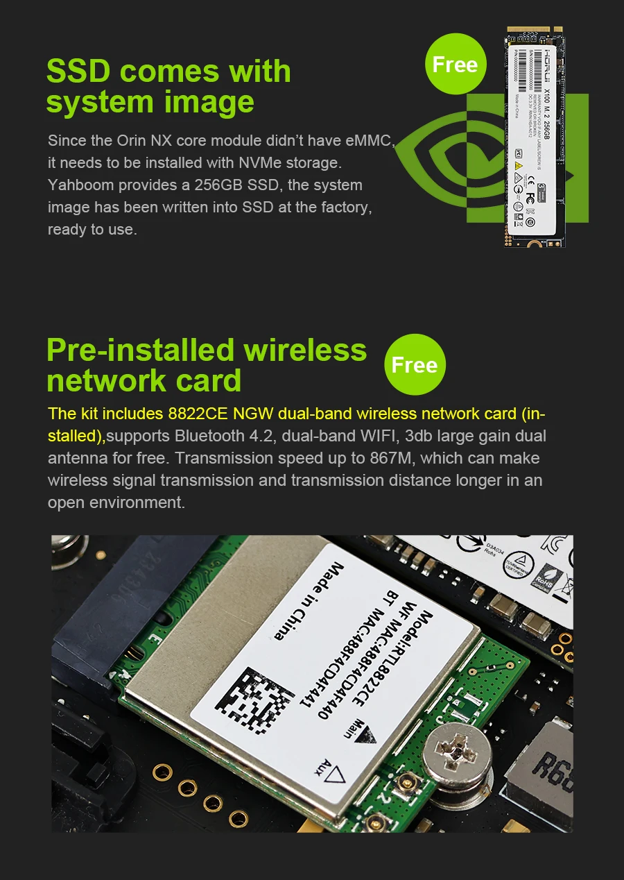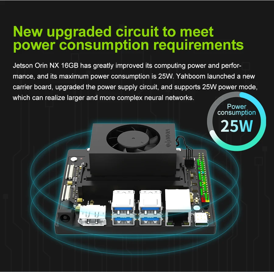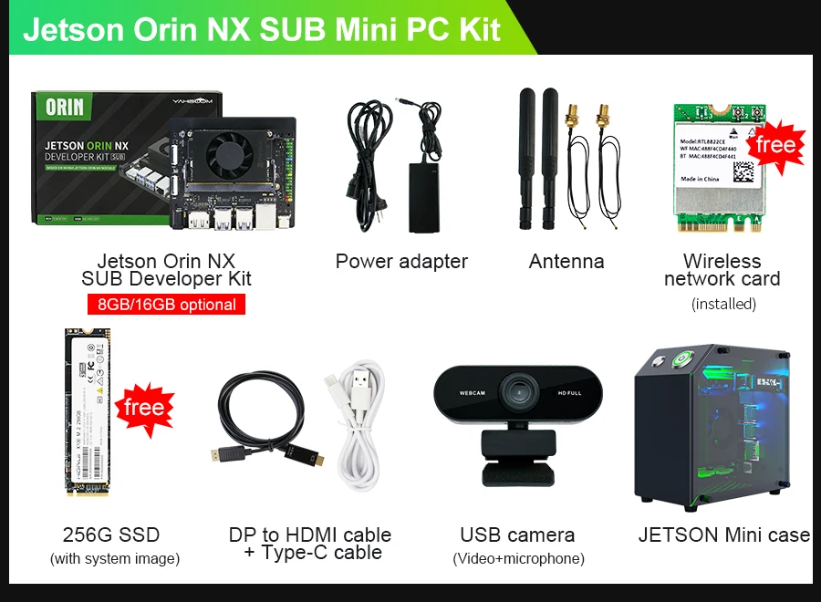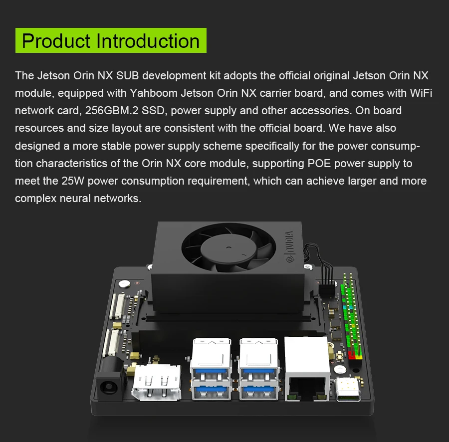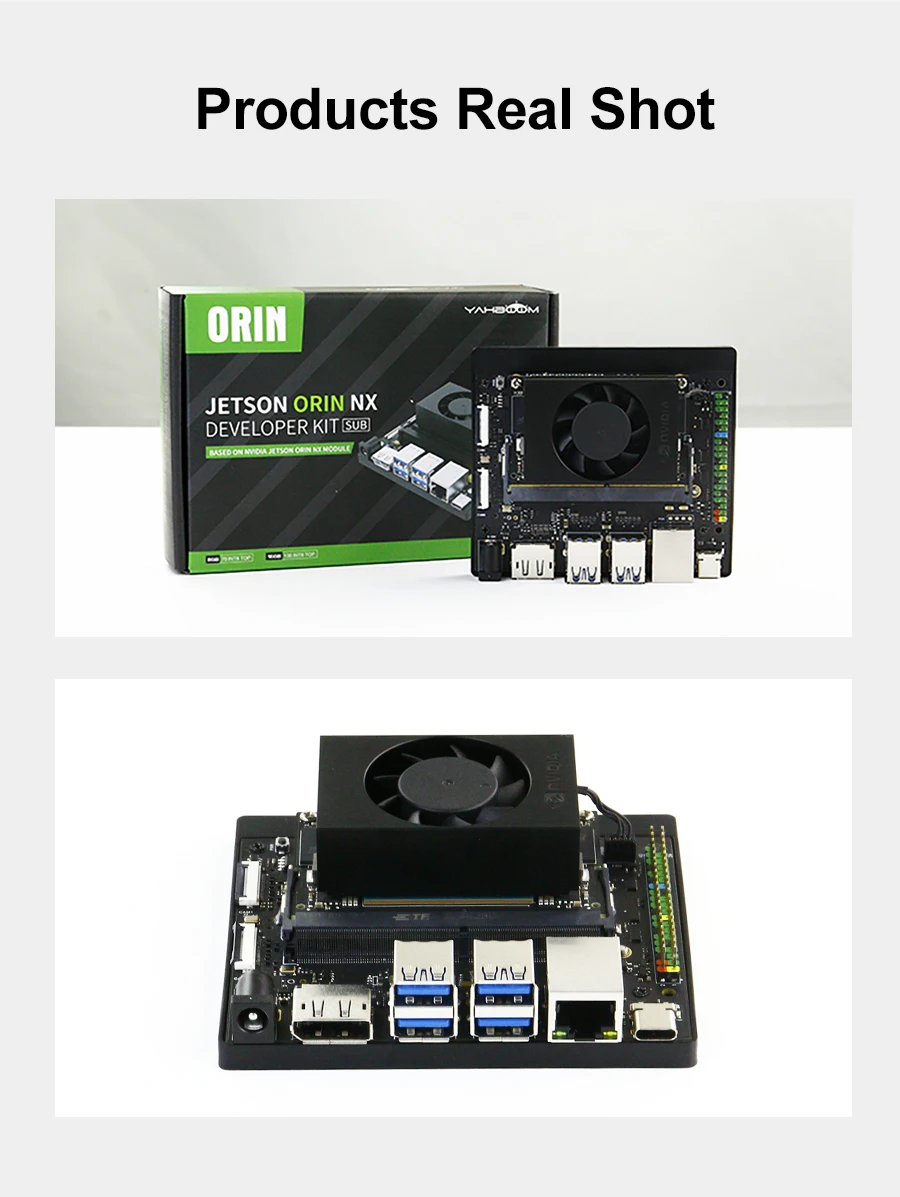 The Jetson Orin NX SUB developer kit consists of Jetson Orin NX core module and Yahboom Jetson Orin NX carrier board. RAM has 8G/16GB for choice. The computing power can reach 70TOPS and 100TOPS respectively. Yahboom will provide 256GB M.2 SSD that has been written into the system, as well as installed WiFi network card, power supply and other accessories. Users can enjoy Orin NX quickly without complex environment setup steps.