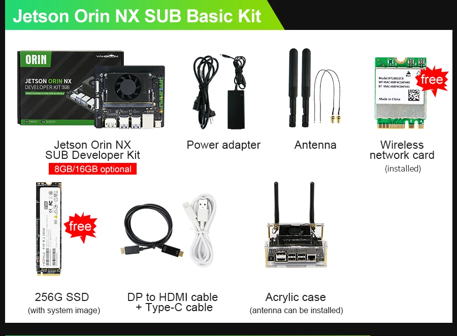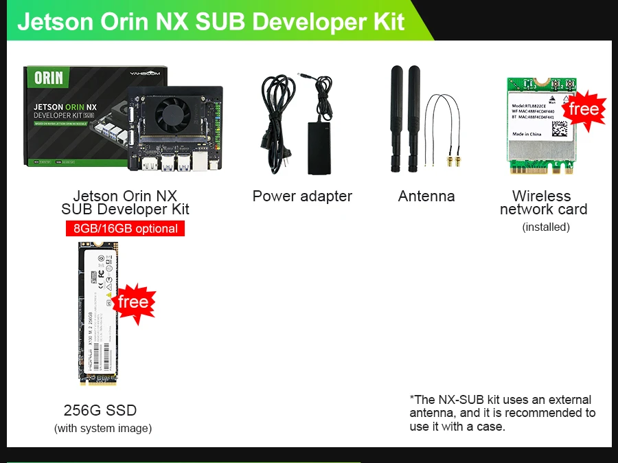 Developer kit includes a 256GB M.2 SSD solid-state drive, WiFi network card antenna, and power supply.