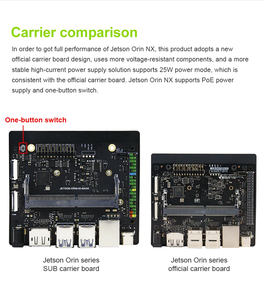 Compared with Jetson Xavier NX, Jetson Orin NX interface resources are optimized and upgraded, the performance is improved by 3~5 times, and the memory read and write speed is doubled.
