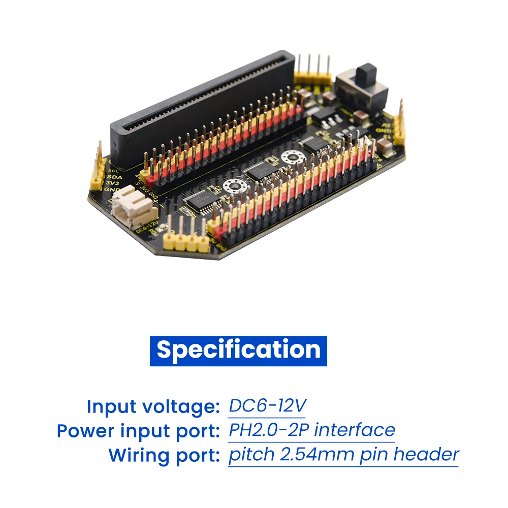 This expansion board can be connected to external power(DC 6-12V , PH2.0-2P interface) and come with a DIP switch for controlling power.