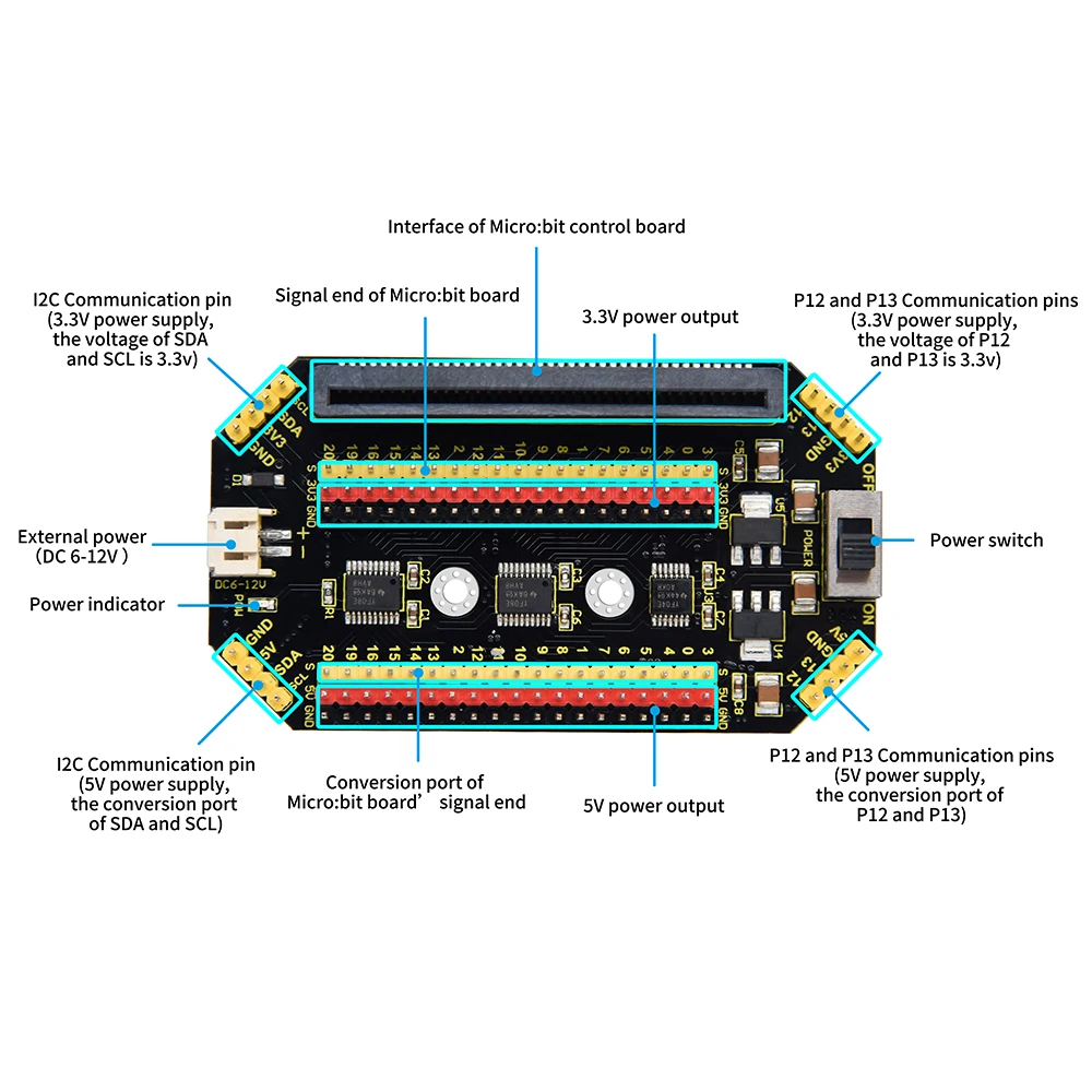 There are two groups of 4P pins extended for I2C communication interface(3.3V and 5v power supply), and another two sets of 4p pins extended for P12 and P13(3.3V and 5v power supply).
