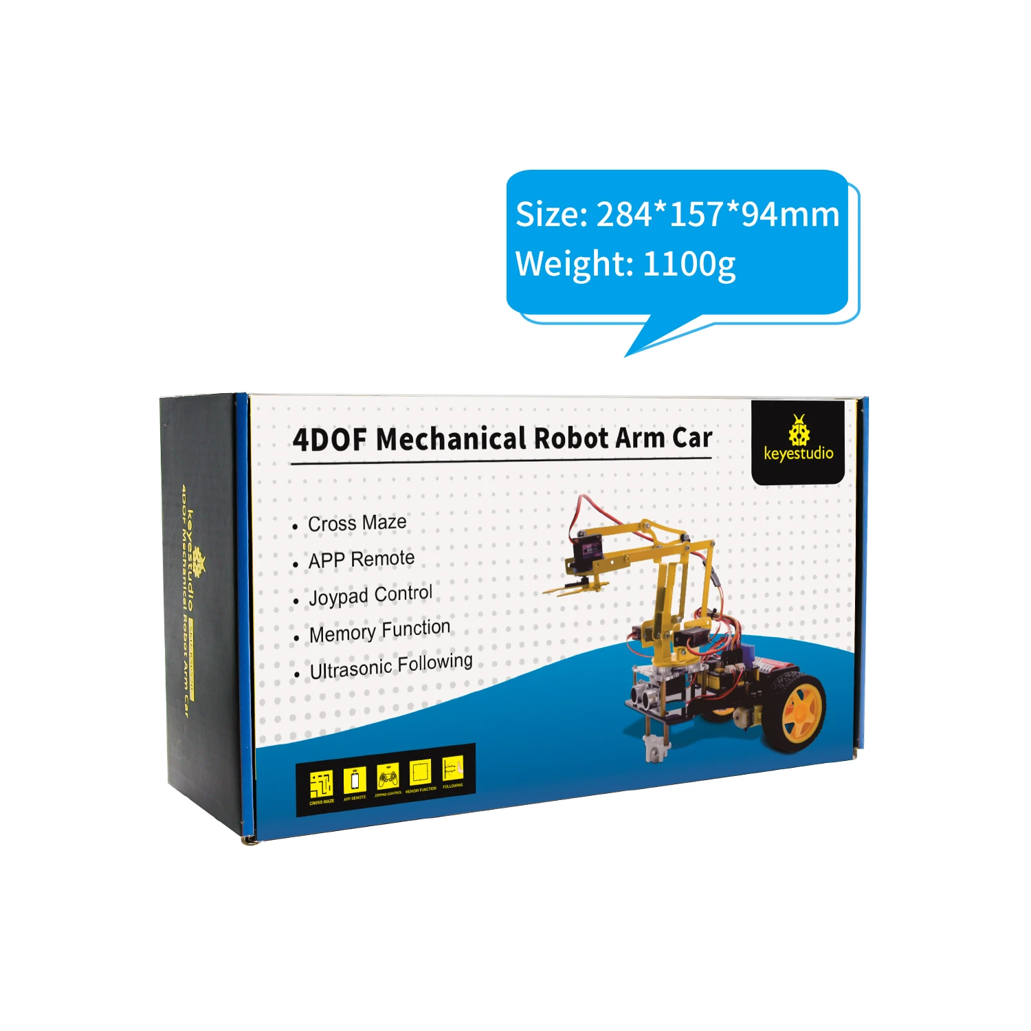 On tackling this problem, KEYES group has launched a 3 in 1 learning kit-4DOF mechanical robotic arm car. With this kit, you could acquire how to control mechanical arm and smart car, what’s more, they can be combined to transform into mechanical arm smart car. I believe that you can’t help opening it to get started.