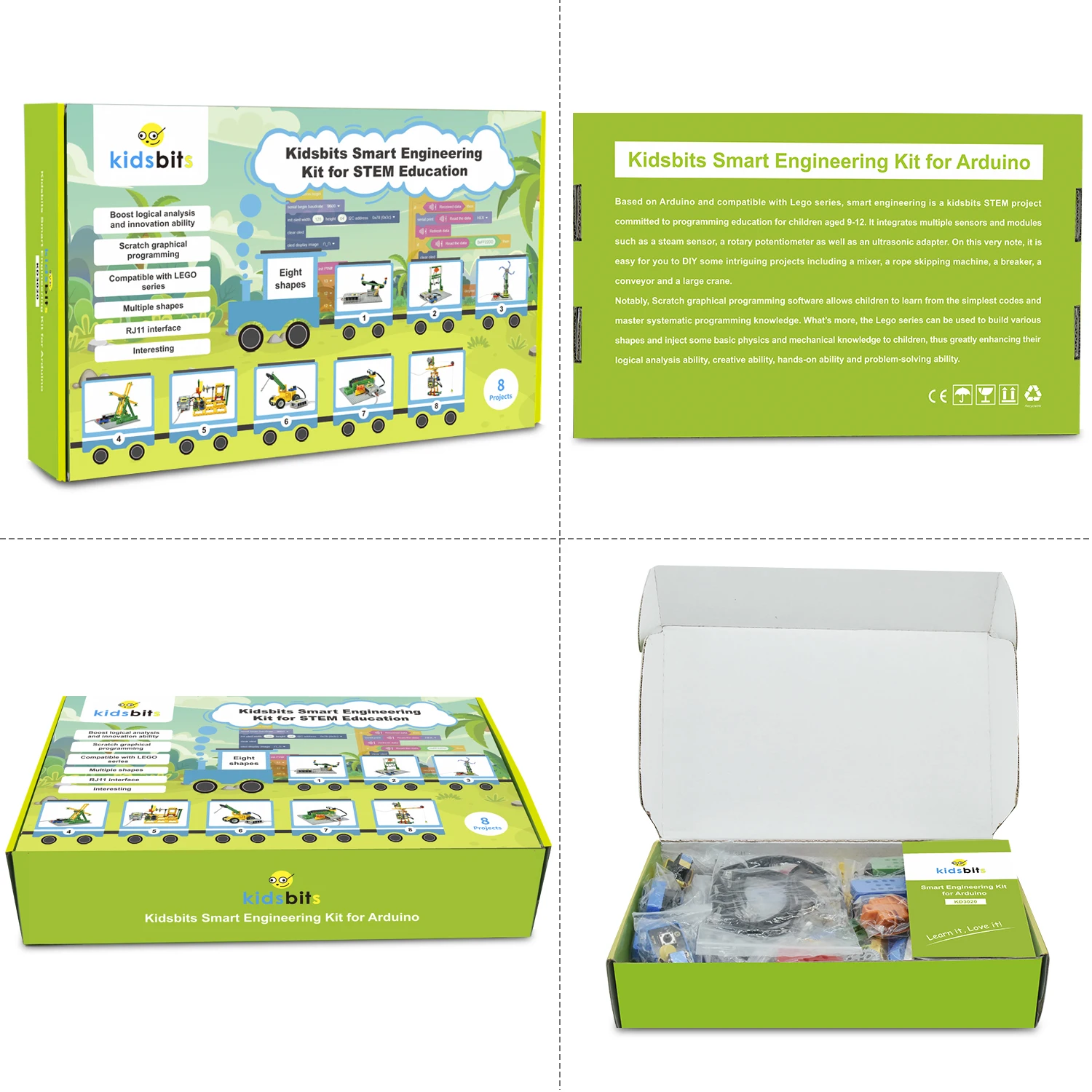 Based on Arduino and compatible with Lego series, smart engineering is a kidsbits STEM project committed to programming education for children aged 9-12. It integrates multiple sensors and modules such as a steam sensor, a rotary potentiometer as well as an ultrasonic adapter. On this very note, it is easy for you to DIY some intriguing projects including a mixer, a rope skipping machine, a breaker, a conveyor and a large crane.