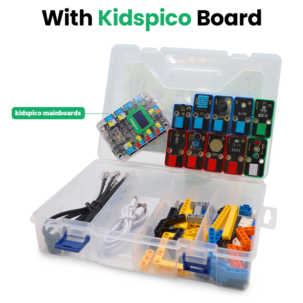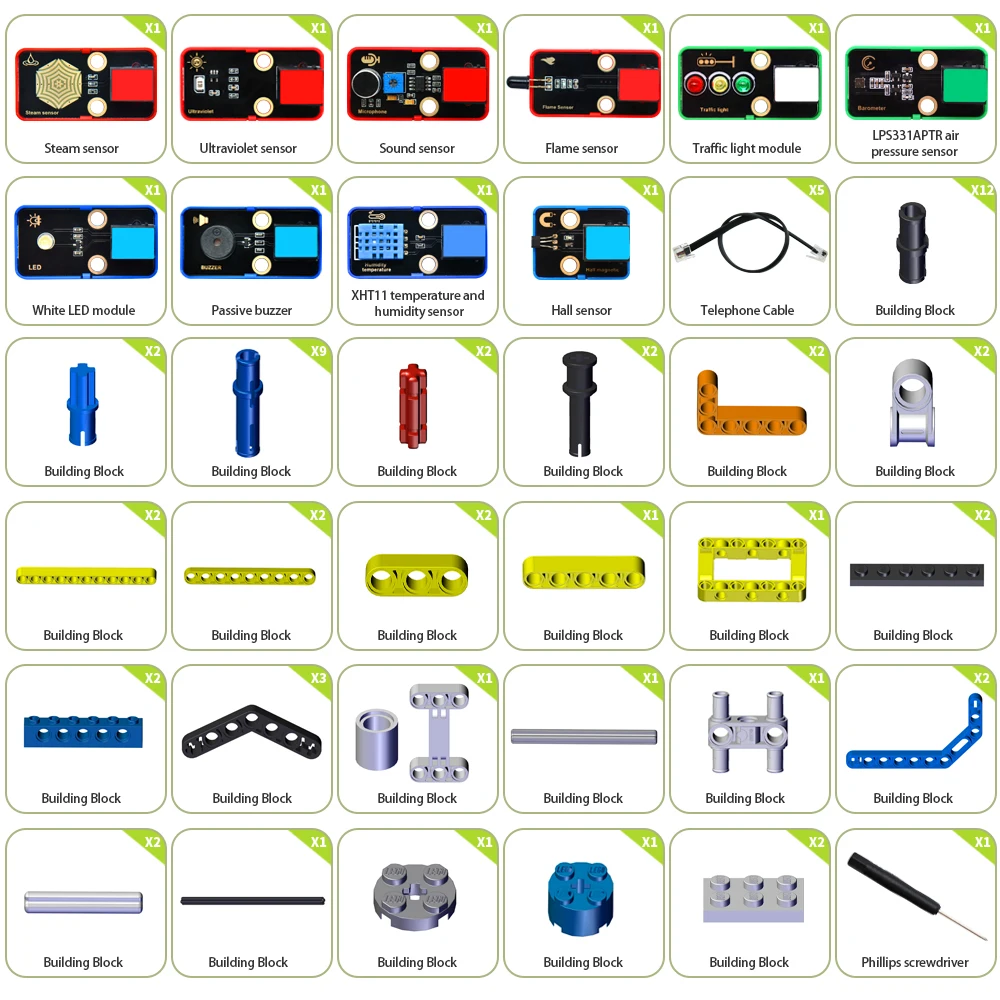 In this kit, multiple sensors and modules are included: white LED module, Hall sensor, passive buzzer, XH11 temperature and humidity sensor, steam sensor, flame sensor, sound sensor ultraviolet sensor, traffic light module and air pressure sensor. Besides, we design seven comprehensive experiments for the kit with building blocks: rain detection, fire alarm, magnetic field detection, thunder detection, temperature detection, ultraviolet detection and air pressure detection. These building blocks are provided, so you may design forms at will, which greatly improves logical analysis, creativity, hands-on skills and problem-solving ability.