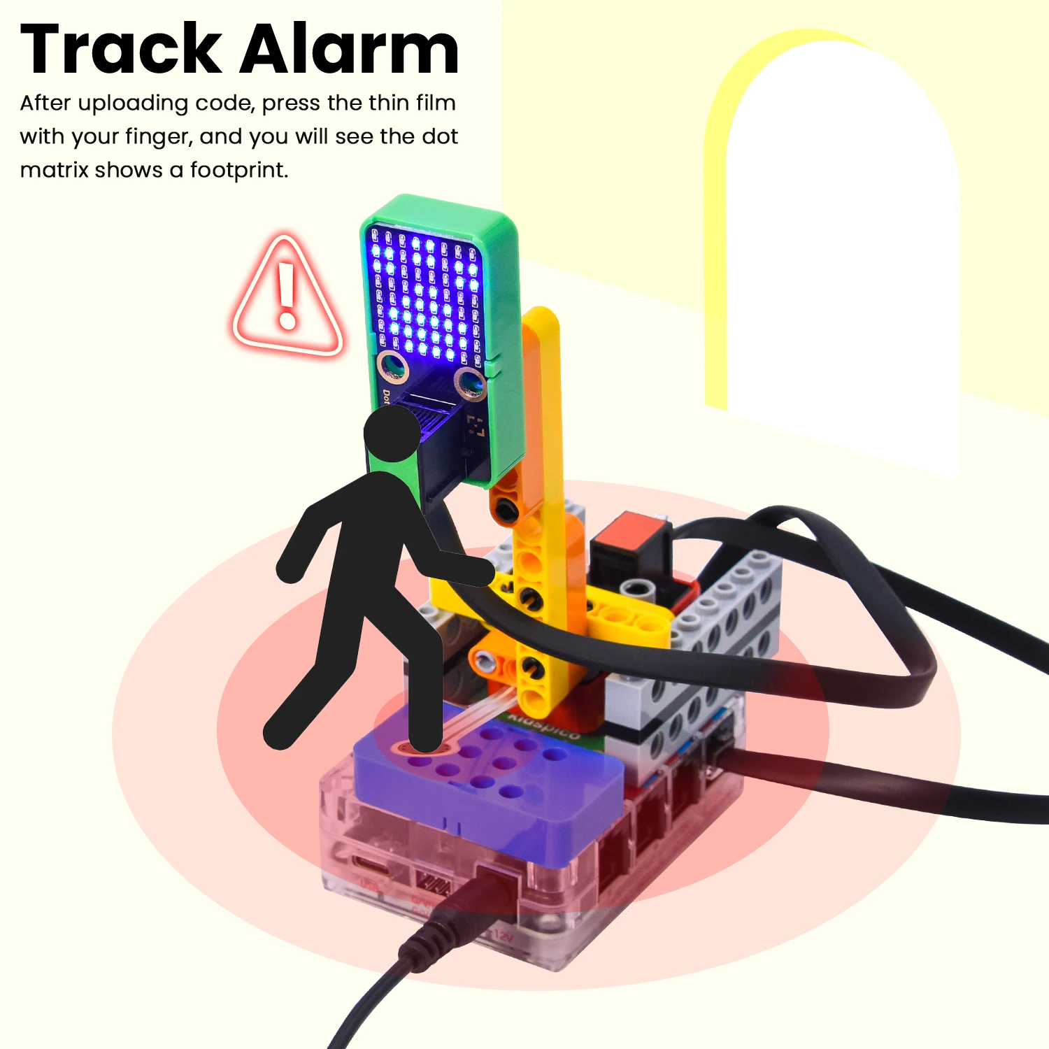 In this kit, multiple sensors and modules are included: white LED module, 6812 RGB module, HT16K33_8X8 dot matrix, tilt sensor, 8002b power amplifier, thin film pressure sensor, PIR motion sensor, RFID module, AK8975 3-axis magnetic sensor, and 270° servo. Besides, we design four comprehensive experiments for the kit with building blocks: Card-scanning Door-lock Control Device, Invasion Alarm, Track Alarm, and Motion Alarm. These building blocks are provided, so you may design forms at will, which greatly improves logical analysis, creativity, hands-on skills and problem-solving ability.