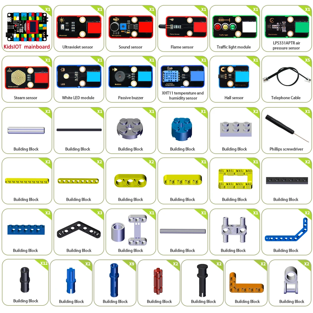 In this kit, multiple sensors and modules are included: white LED module, Hall sensor, passive buzzer, XH11 temperature and humidity sensor, steam sensor, flame sensor, sound sensor ultraviolet sensor, traffic light module and air pressure sensor. Besides, we design seven comprehensive experiments for the kit with building blocks: rain detection, fire alarm, magnetic field detection, thunder detection, temperature detection, ultraviolet detection and air pressure detection. These building blocks are provided, so you may design forms at will, which greatly improves logical analysis, creativity, hands-on skills and problem-solving ability.