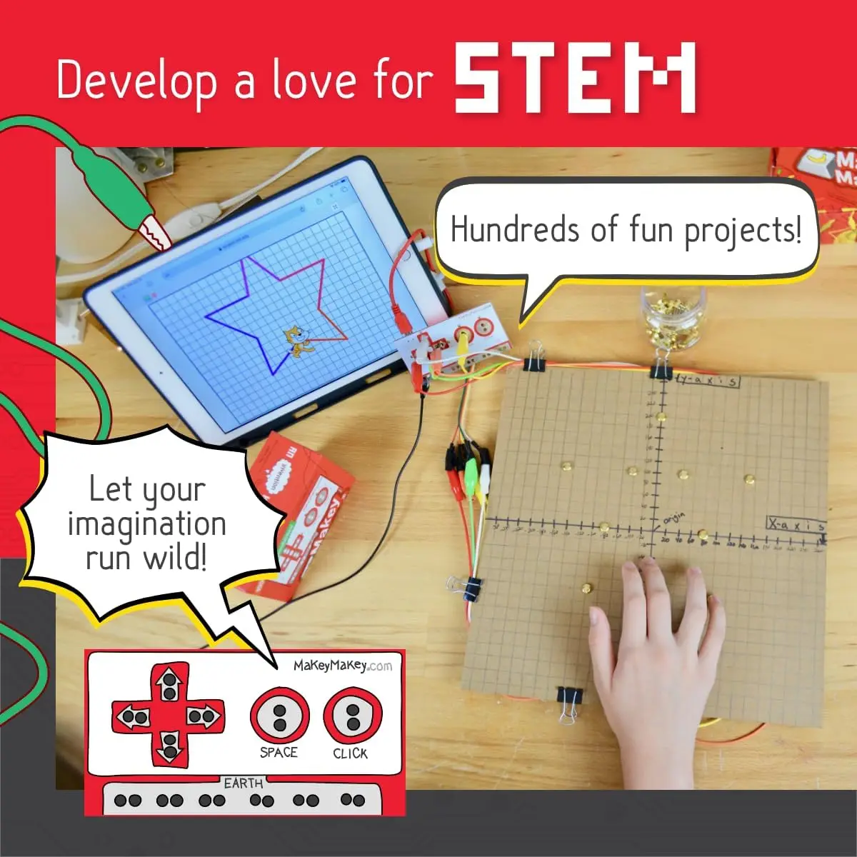 Connect to the world: Turn bananas into touchpads! Craft your own video game controller! Make musical circuits with items around the house! Makey Makey extends beyond the screen and brings engineering and coding concepts to life in exciting new ways.