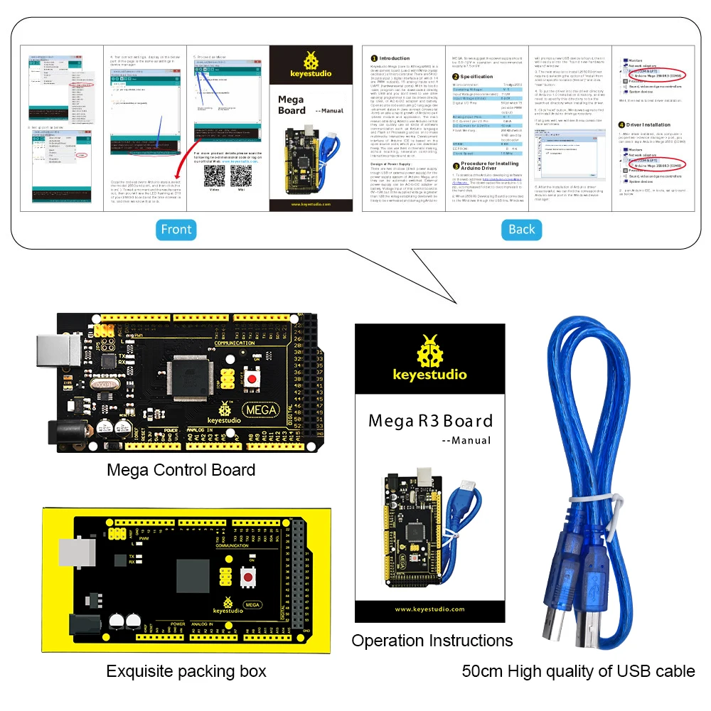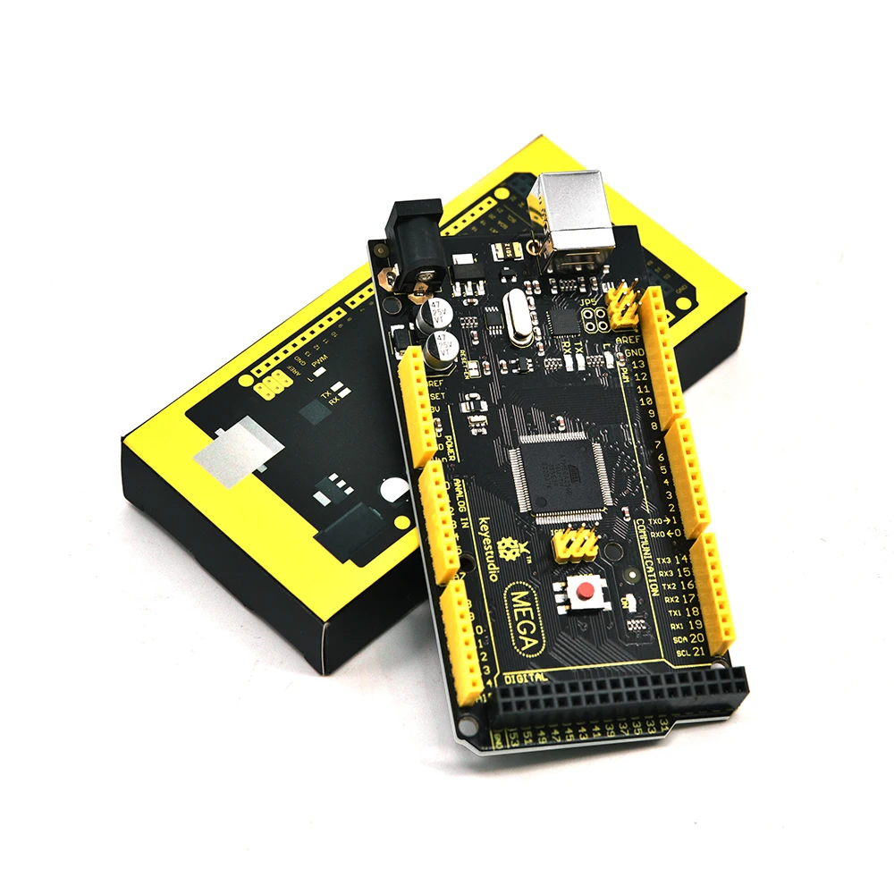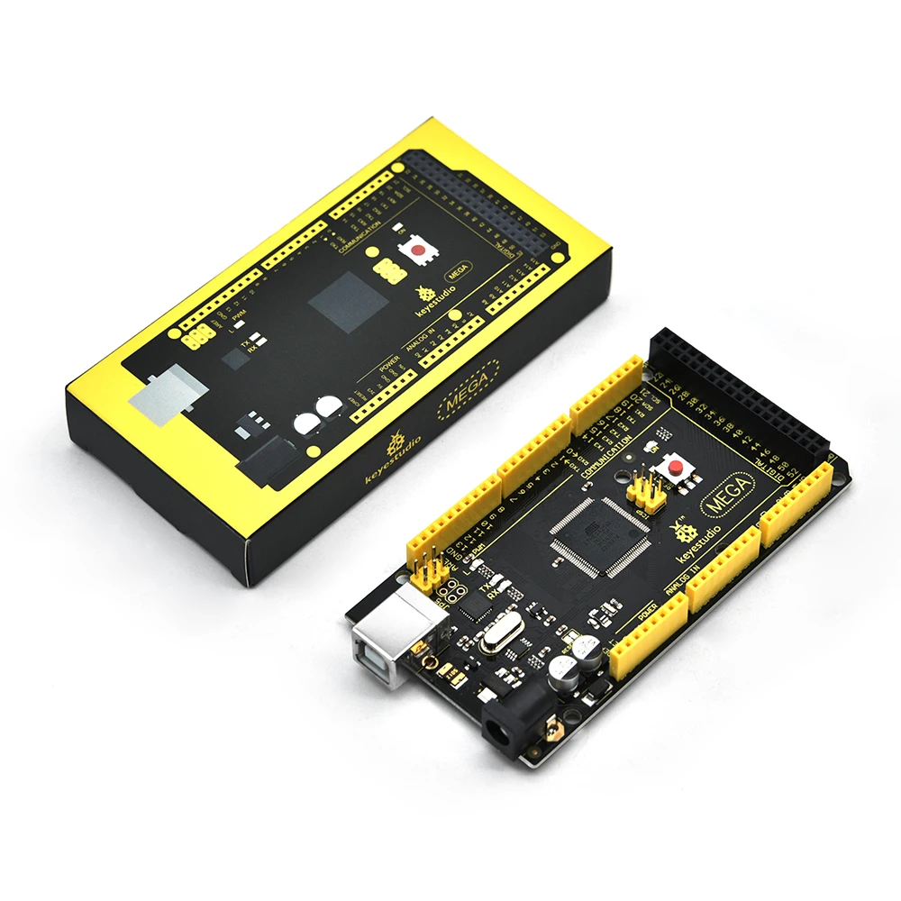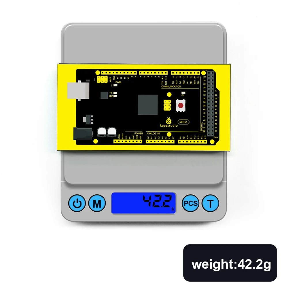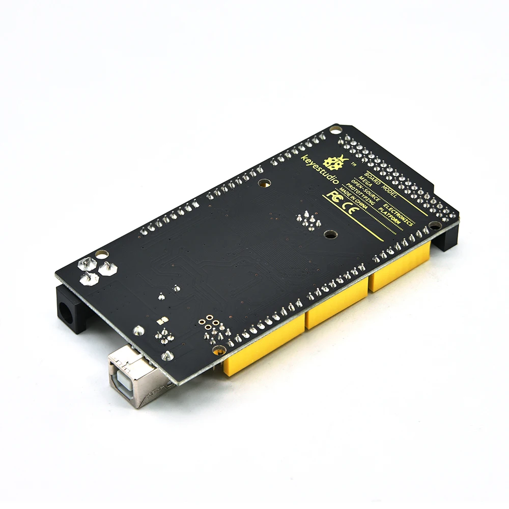 Mega (core to ATmega2560) is a development board (used with16MHz crystal oscillator ) of microcontroller. There are 54 I/O (input/output ) digital interfaces (of which 14 are PWM outputs), 16 analog inputs and 4 UART (hardwareserial ports). With its bootloader, program can be downloaded directly with USB and you don’t need to use other external programmer. It can be driven directly by USB, or AC-to-DC adapter and battery.