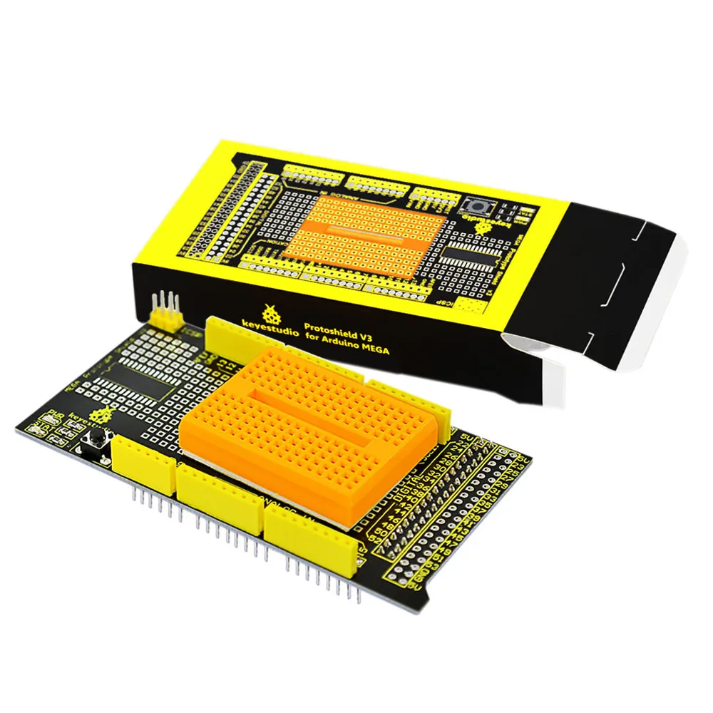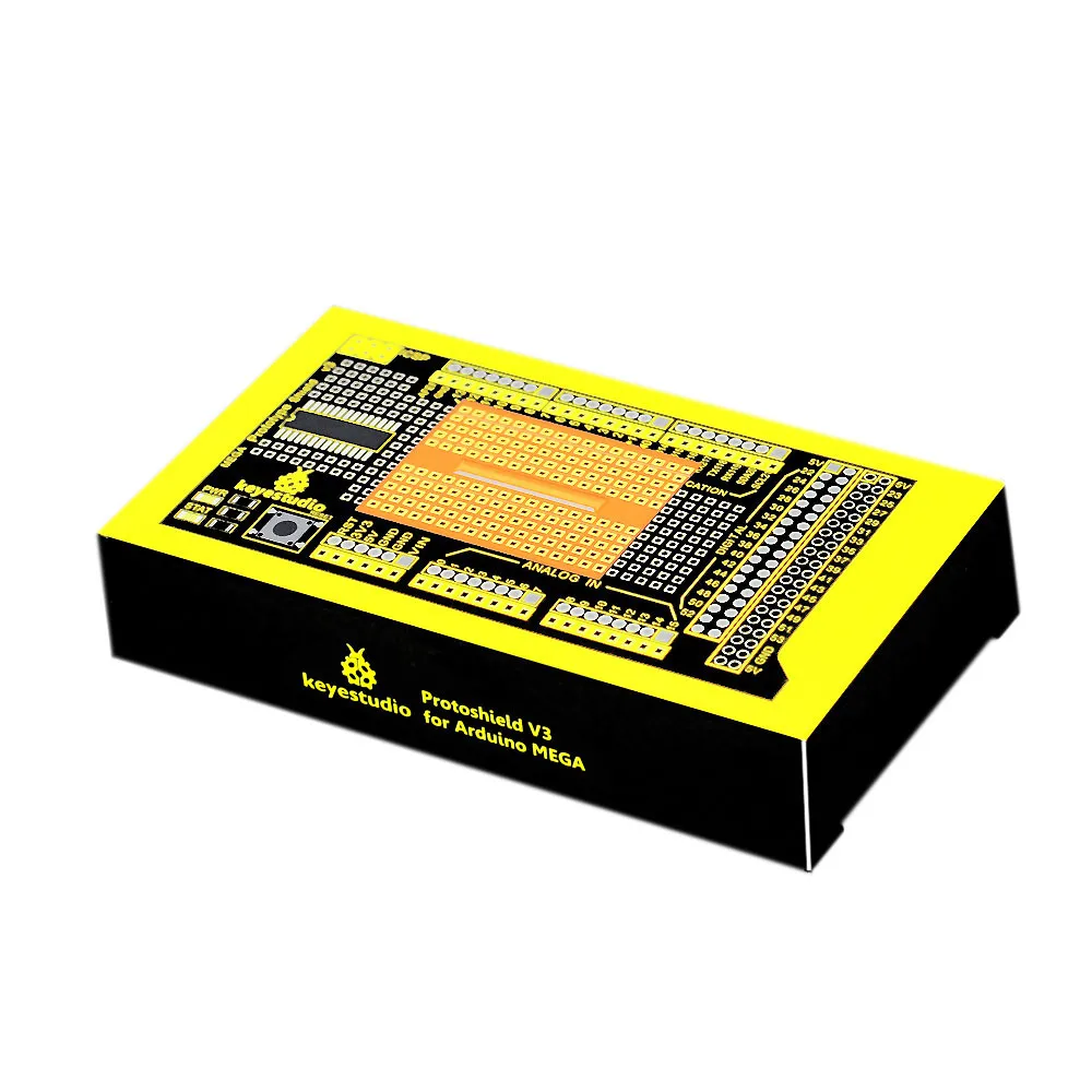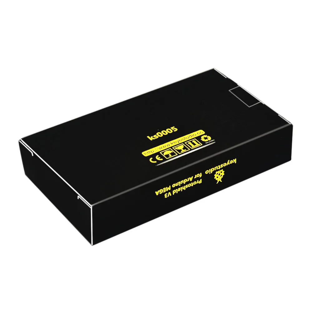 The latest Keyestudio protoshield V3 for Aduino adopts PCB gold immersion process. The gold square bonding pad is of small spacing for the convenience of users;SOP28 SMD components are encapsulated so that users won’t be limited by through-hole component; This shield can be inserted onto Aduino MEGA controller directly for the built-up of various proto circuit or pasted with Mini breadboard for the conduct of various circuit experiments. The shield is equipped with power indicator and status indicator as well as reset button.
