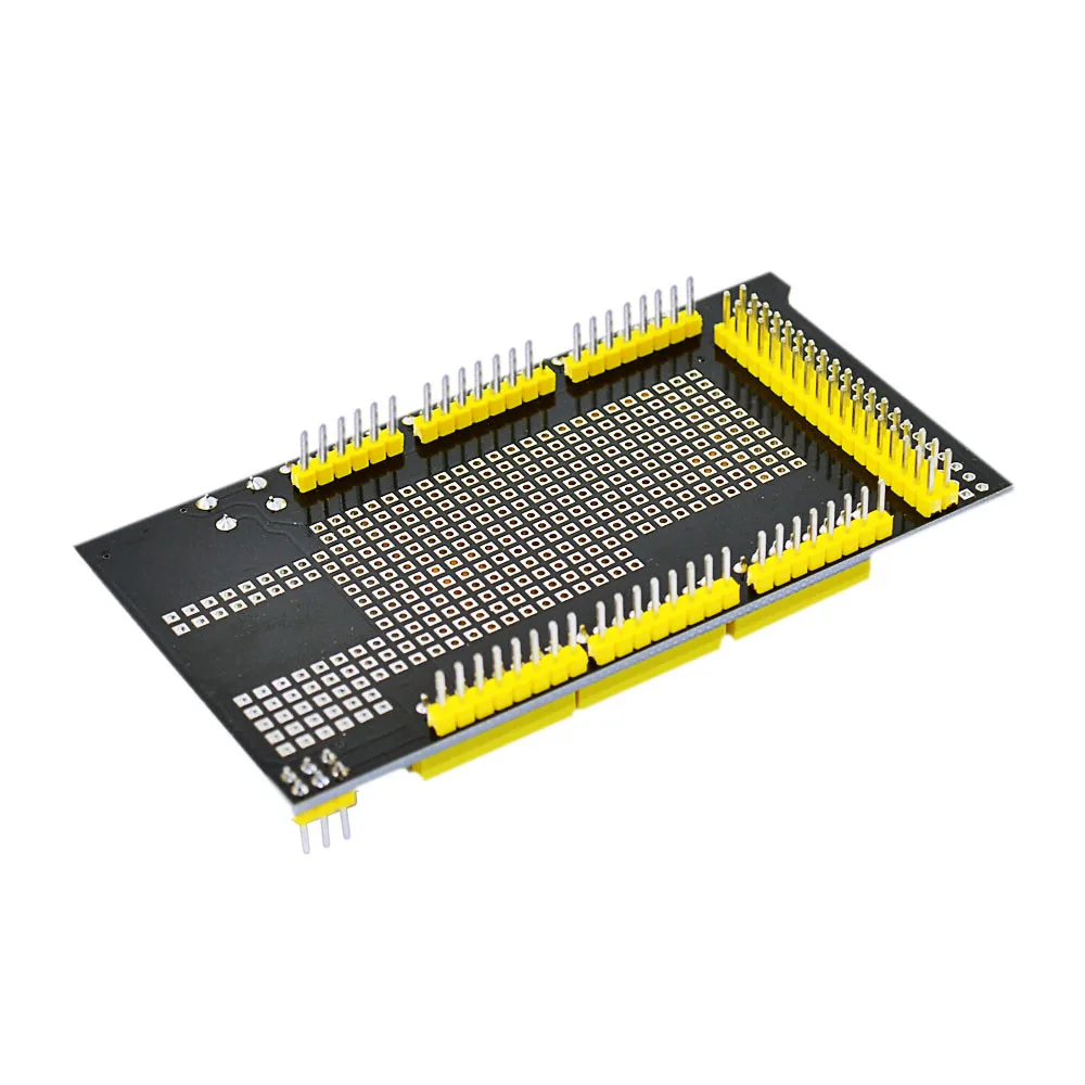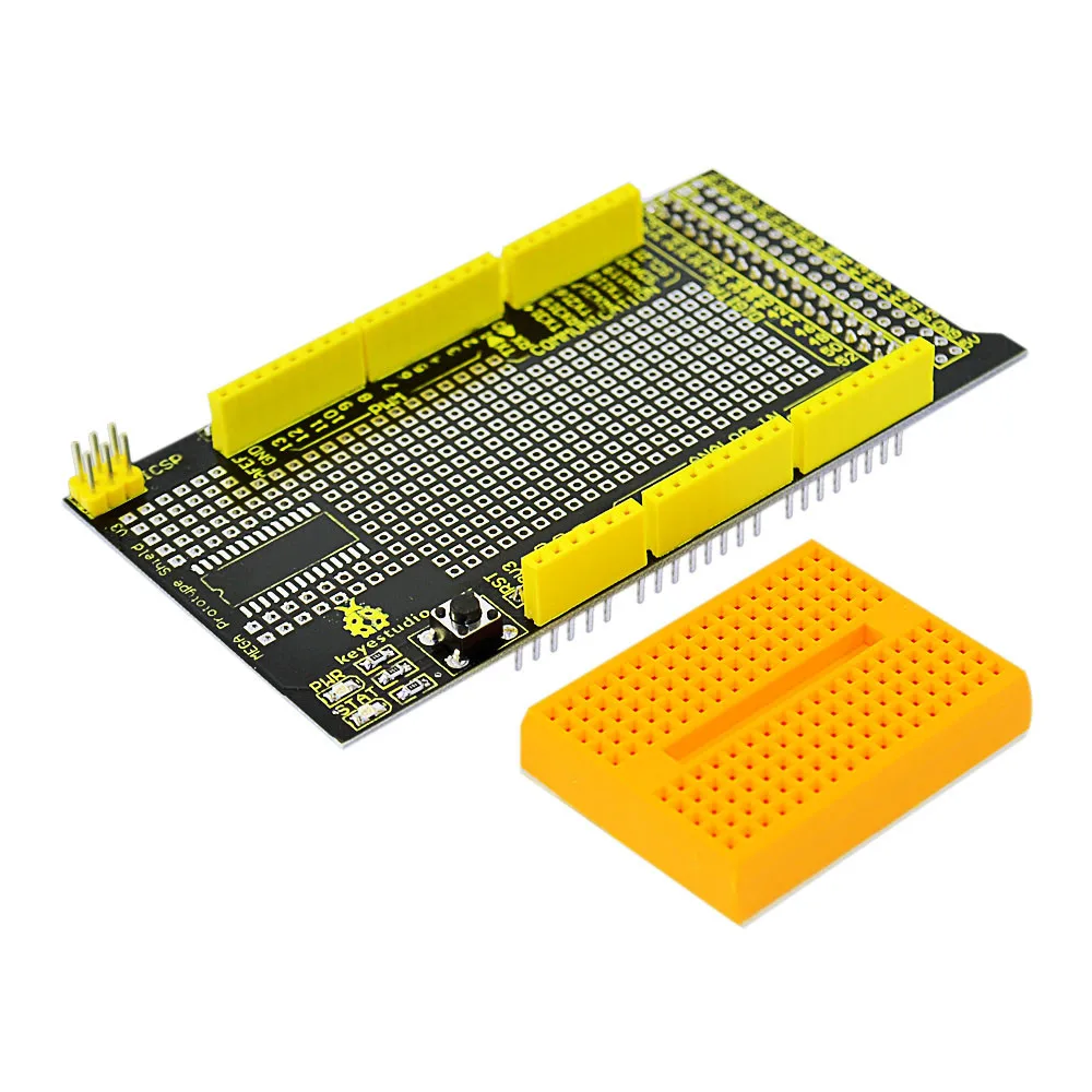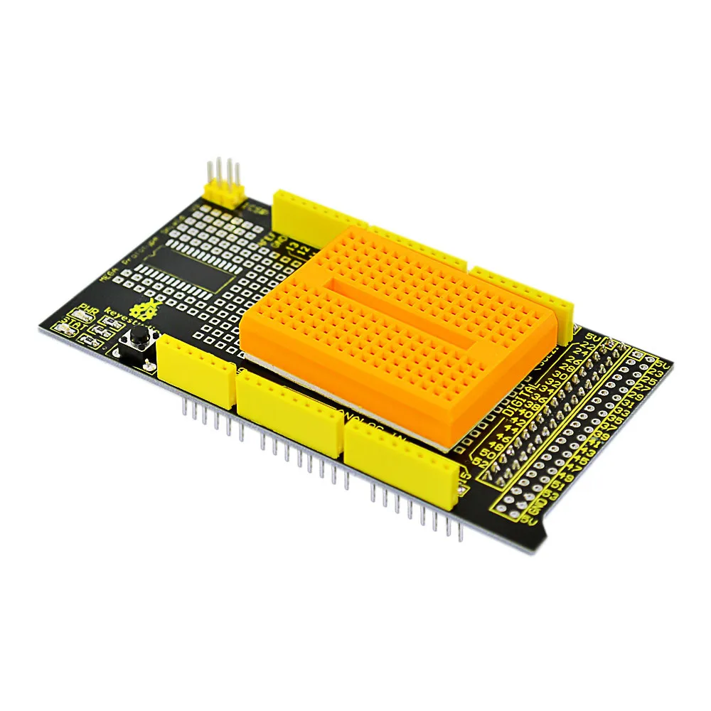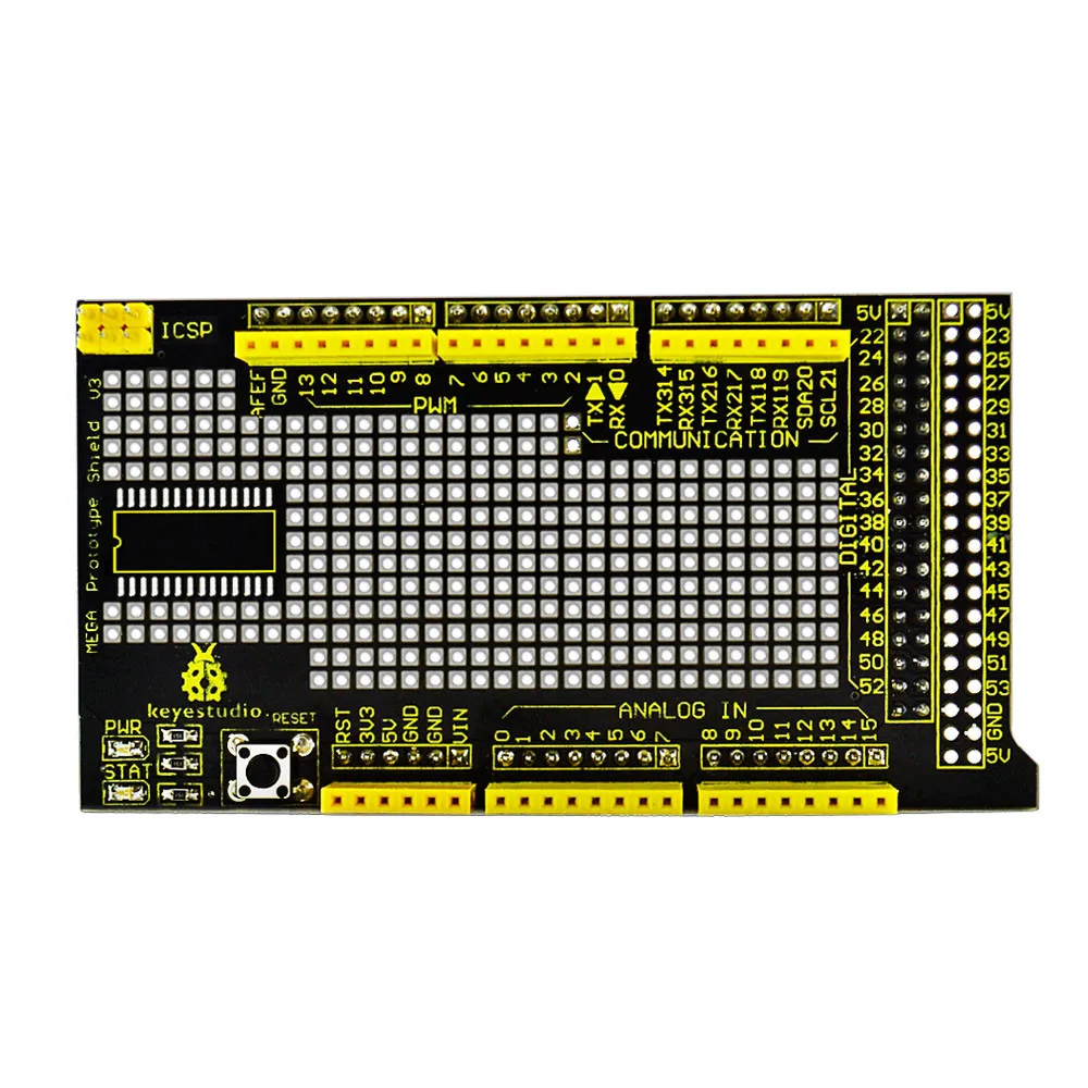 The latest Keyestudio protoshield V3 for Aduino adopts PCB gold immersion process. The gold square bonding pad is of small spacing for the convenience of users;SOP28 SMD components are encapsulated so that users won’t be limited by through-hole component; This shield can be inserted onto Aduino MEGA controller directly for the built-up of various proto circuit or pasted with Mini breadboard for the conduct of various circuit experiments. The shield is equipped with power indicator and status indicator as well as reset button.