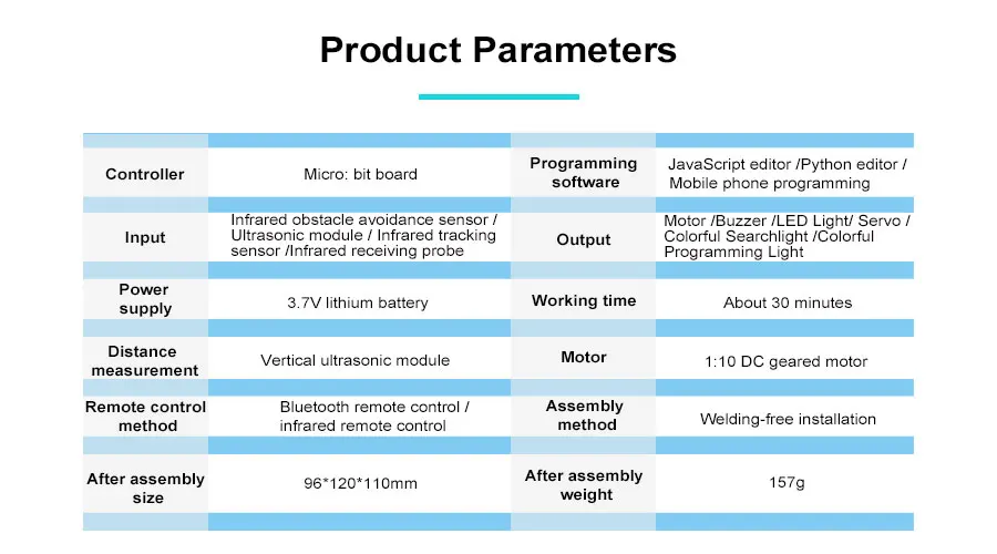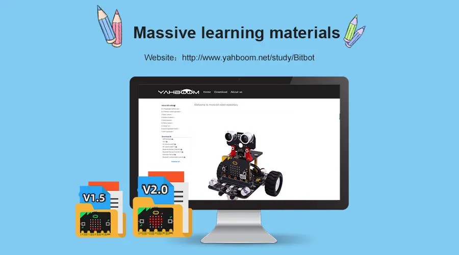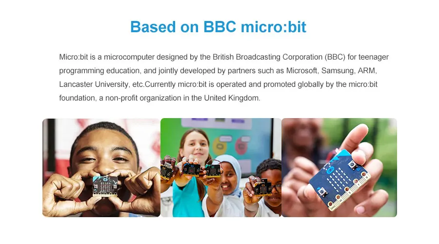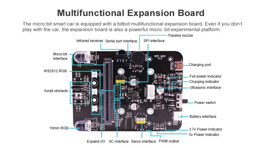 bit smart robot is developed with the most popular Micro:bit board as the core controller. Using Micro:bit dot matrix screen as the body, the entire vehicle adopts elaborate metal motor, high-quality battery and firm bracket to create a compact and beautiful appearance. And it is controlled by Android/iOS mobile APP remote controller connecting with Micro:bit on board Bluetooth. We also offer three kinds of comprehensive courses: simple development board experiments, more complex expansion board experiments, and interesting smart robot experiments. It is the best choice for all makers, educators, and amateurs.