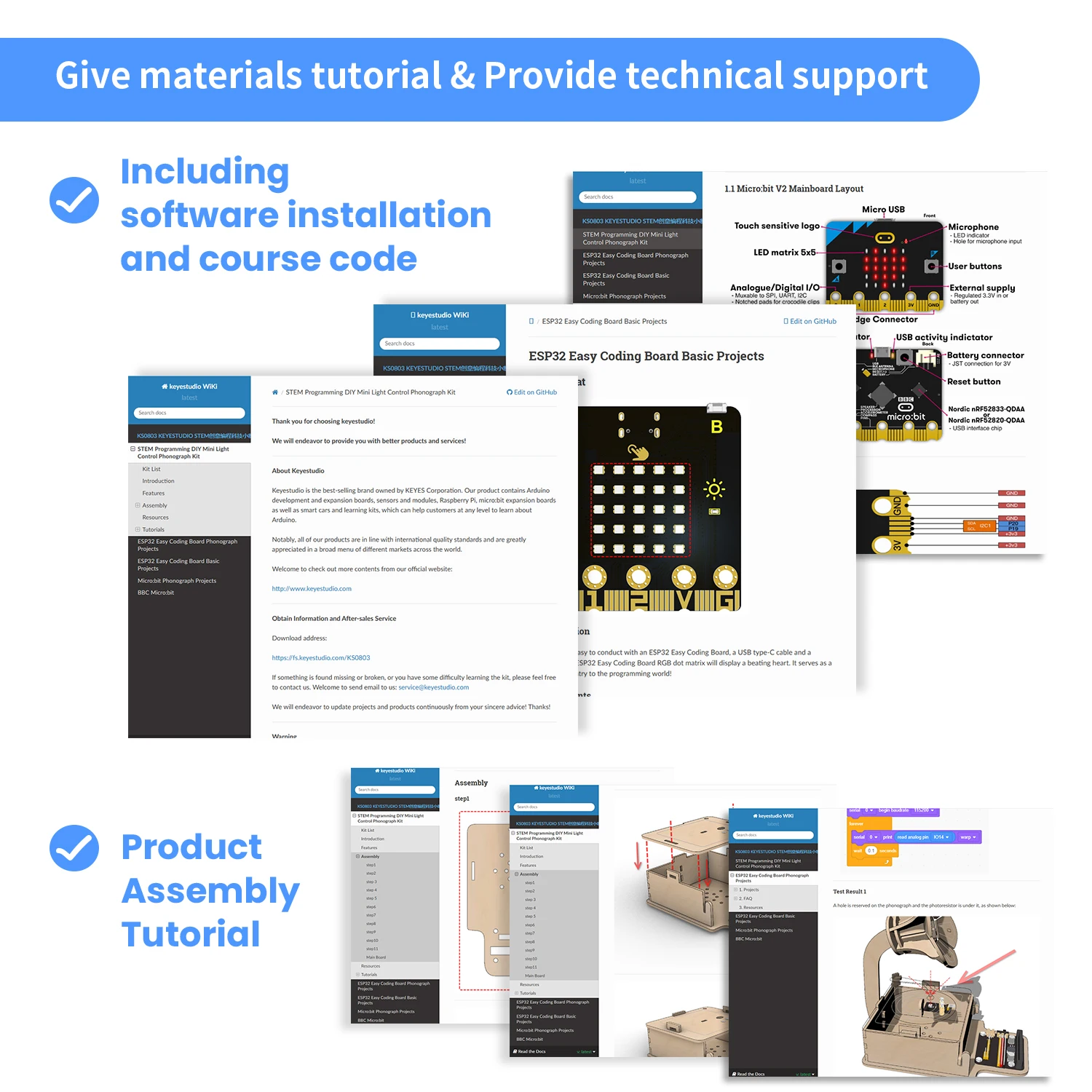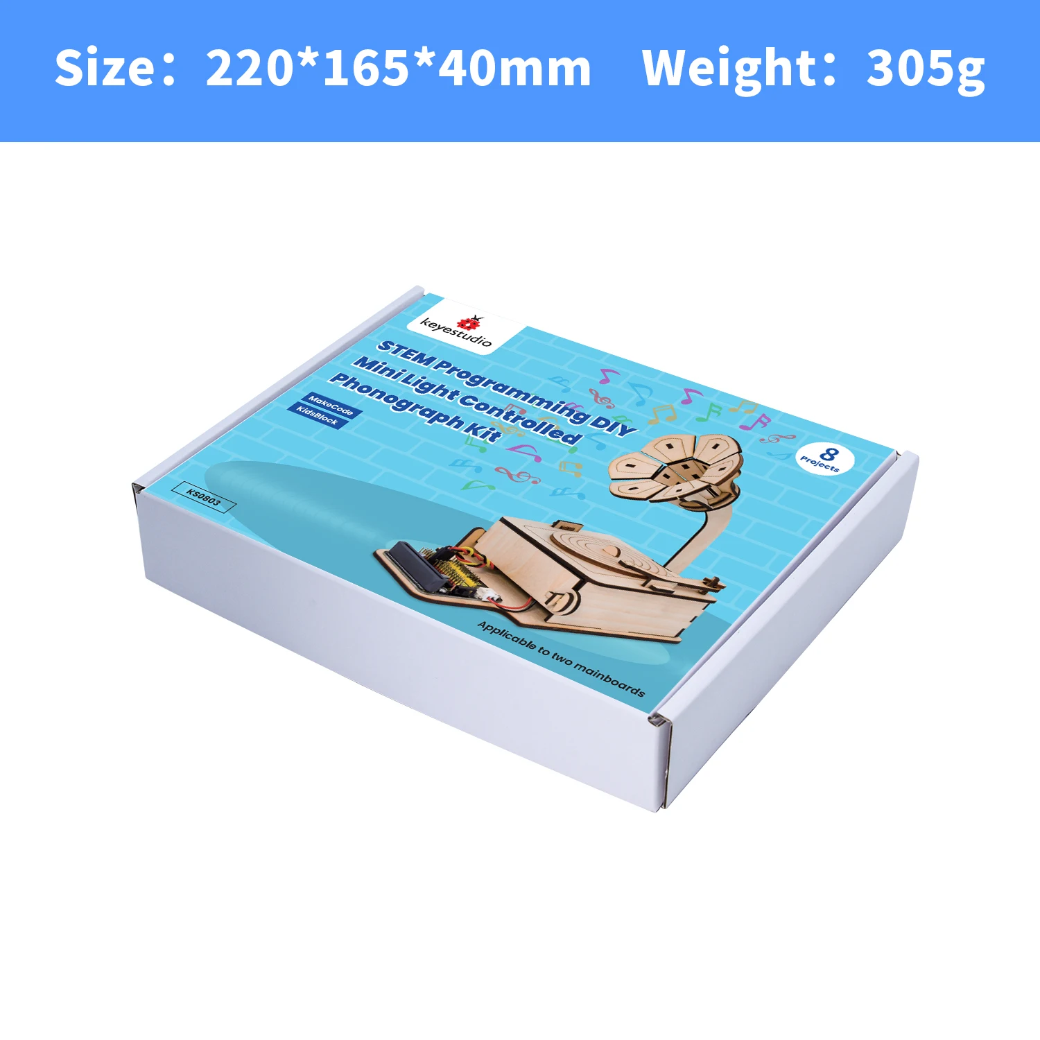 This kit integrates a photoresistor and 8002B power amplifier, which are compatible with micro:bit boards and ESP32Easy Coding Boards. We write codes via Makecode and KidsBlock to play beautiful melody or even to achieve morecreative and interesting functions.