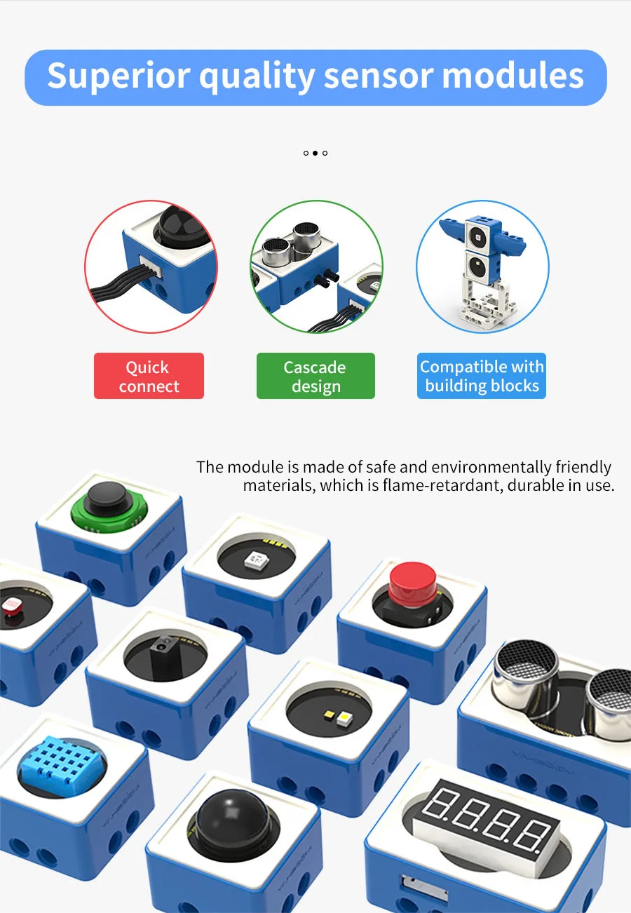 This world of module programmable robot kit includes 1 professional sensor expansion board, 2 building block servos, 10 electronic sensor modules and 300+ building block parts. Support MakeCode and Python programming, suitable for users over 6 years old. We have created more than 20 kinds of models, and also provided detailed experimental cases for children to learn programming and sensor knowledge while playing with building blocks.