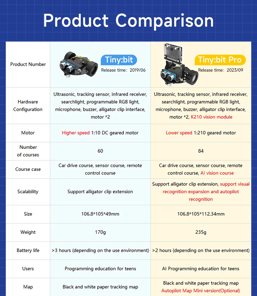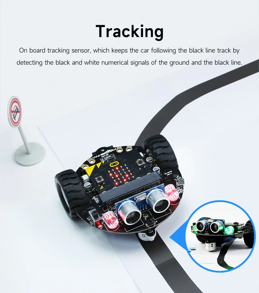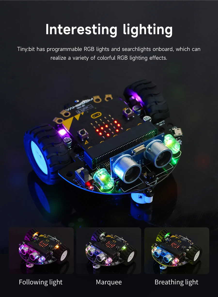 Tiny:bit is a robotic car for the micro:bit education market. It is compact, easy to assemble, and easy to move in tight spaces. The Tiny:bit smart car is based on the micro:bit development board design and uses the online code programming of MakeCode and Python. Rich sensor applications allow Tiny:bit for easy interaction. The Tiny:bit smart car has a set of alligator clips on the rear that can be creative and expand.