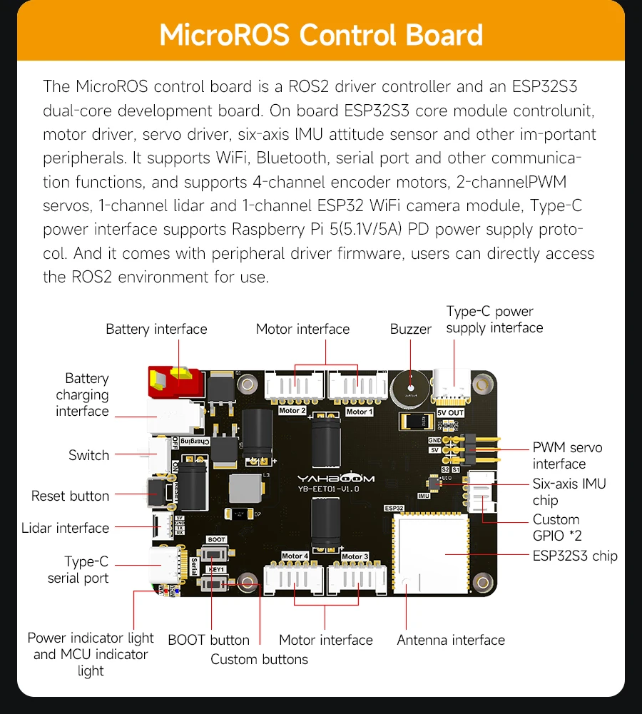 This ROS educational robot car migrates complex computing tasks to PC virtual machine environment, no need embedded development board (Jetson NANO/Raspberry Pi) as the main controller. The data and information generated by the car are remotely transmitted to the PC virtual machine system by the ESP32 co-processor through the WIFI UDP function of MicroROS, and complete the calculation and generate decisions. Yahboom provide 4PCS 310 encoder motor, 7.4V large-capacity battery, professional MicroROS control board, TOF lidar and other accessories, combined with the ROS2-Humble operating system and Python3 programming to help it achieve obstacle avoidance, following, and mapping navigation, RVIZ simulation, multi-machine synchronization control and other functions.