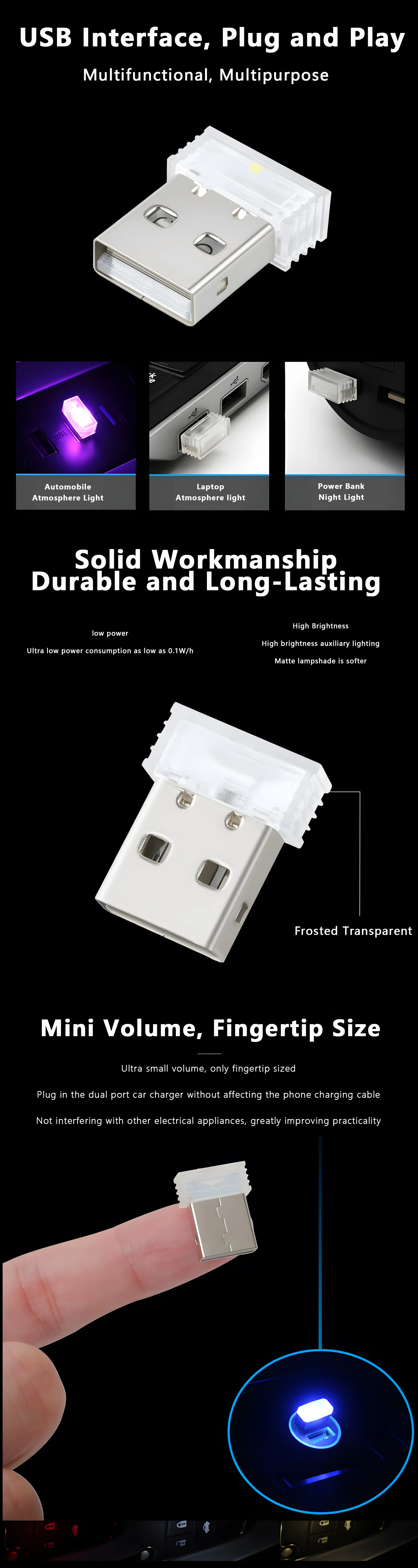 1. Mini USB Car Light, easy to carry, plug and play, easy to use; It Can increase the atmosphere of your night driving.