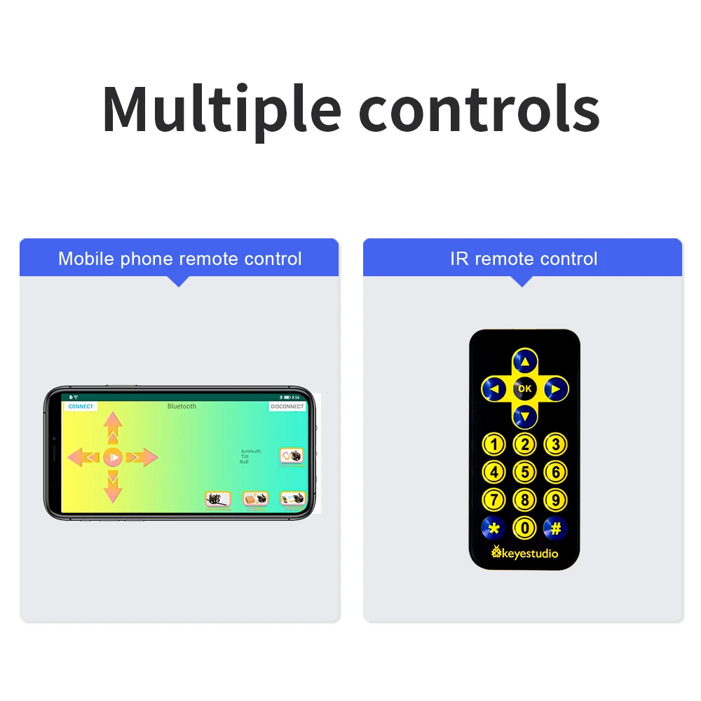 1.Multi-purpose function: Obstacle avoidance, following, IR remote control, Bluetooth control, confined with a circle, ultrasonic following and facial emoticons display.
