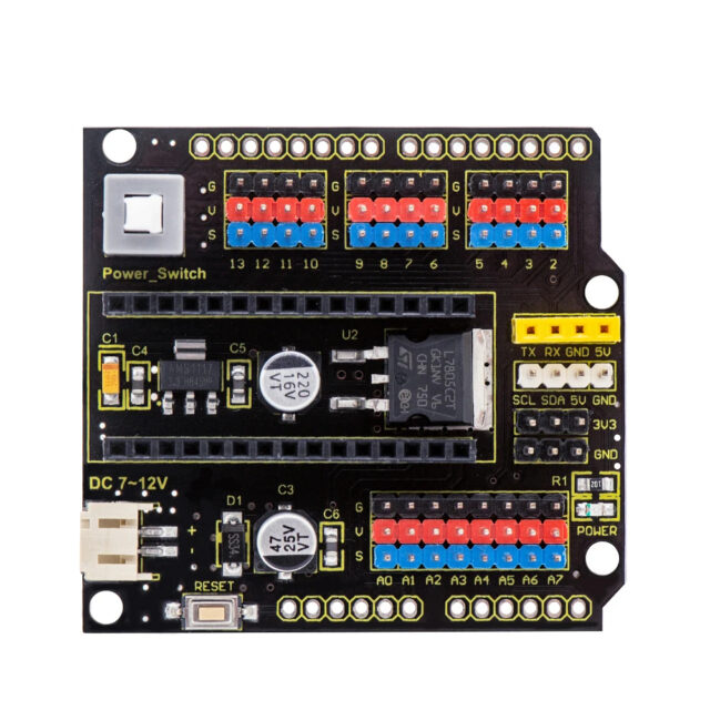 keyestudio Nano ch340 is a tiny control board based on Arduino platform, which is deeply popular. However, if want to connect several sensor modules to keyestudio Nano ch340, and connect external power, we need to use breadboard and a bunch of jumper wires, which is pretty inconvenient. We specially design this NANO shield, fully compatible with keyestudio Nano ch340. The NANO shield has brought out digital and analog pins of keyestudio Nano ch340 into 3PIN headers (GND, 5V, Signal) with pin pitch of 2.54mm. The NANO shield also leads out frequently-used communication pins, such as serial port communication and I2C communication. It’s greatly easy to connect keyestudio Nano ch340 and other sensor modules. It comes with a power indicator and a reset button as well. For external power, the NANO shield comes with a PH2.0-2P connector (input DC7-12V); a Power_Switch for power control. To supply power for other sensors, the NANO shield comes with a 3-way DC3.3V power output pin header with pin pitch of 2.54mm. It comes with 4 fixing holes with a diameter of 3mm, so easy to mount on other devices. Features 1. Extends 12 digital pins into 3pin header 2. Extends 8 analog pins into 3pin header 3. Comes with a serial communication pin header (for Bluetooth module) 4. Comes with an I2C communication pin 5. Comes with 3-way DC 3.3V power output pin 6. Comes with a power indicator and a reset button 7. Comes with an external power connector(PH2.0-2P)and a control button Technical Parameters Voltage input: DC7-12V Power connector: PH2.0-2P Pin/Female header: 2.54mm Fixing hole diameter: 3mm Dimensions: 57mm*54mm*17mm Weight: 20.4g |