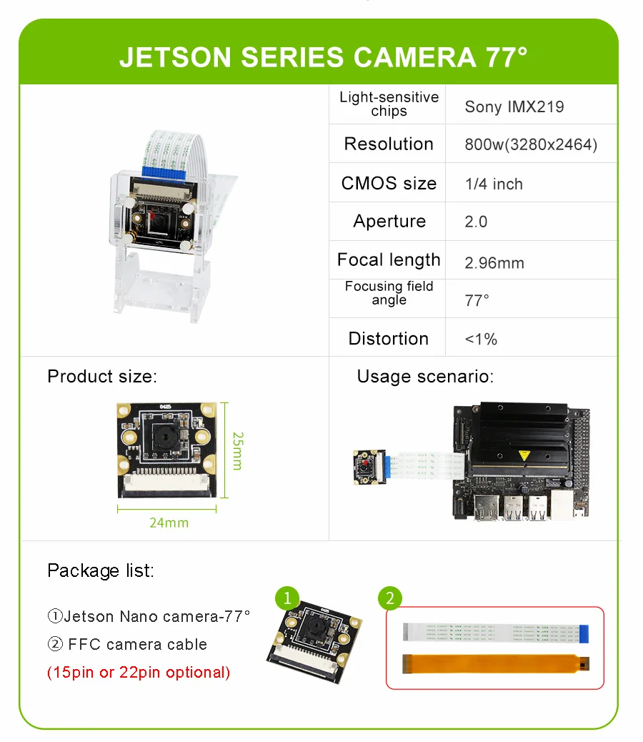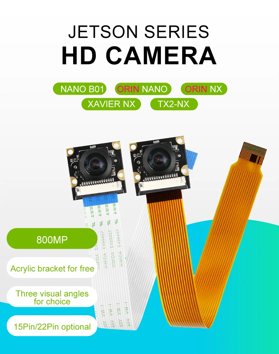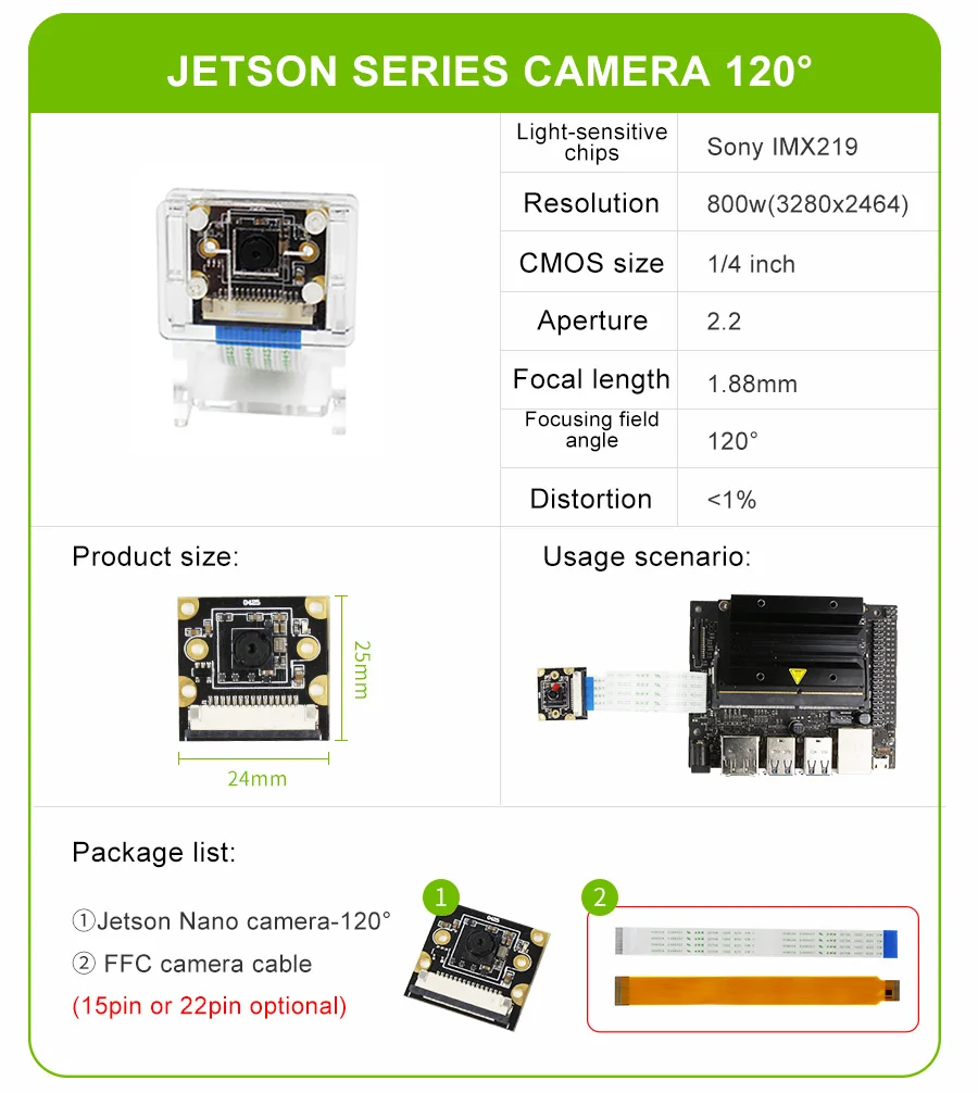 This camera is suitable for Jetson Nano/Xavier NX/TX2 NX/Orin NX/Orin NANO. It adopts Sony IMX219 chip and CSI interface. The pixel is 800W, resolution is 1080P, and the field of view angle is 77°, 120° and 160°. It can be used to neural network, AI vision, real-time image recognition, AI smart robot cars and other fields. We will provide a transparent acrylic bracket for the camera, which can be mounted on the acrylic case.