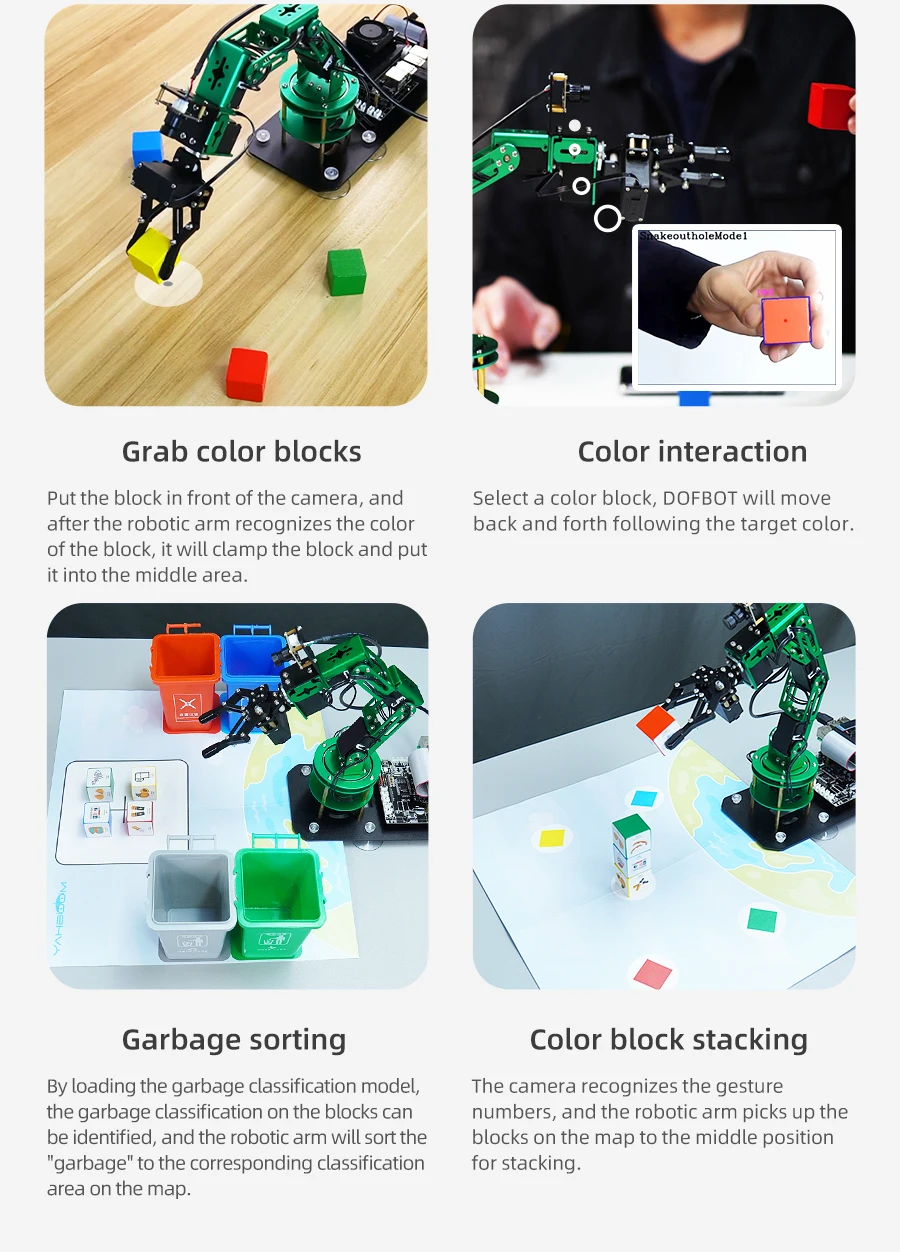 DOFBOT can realize Gesture recognition, color recognition, visual positioning, garbage classification, catch game, face tracking, building blocks stacking and other AI games.