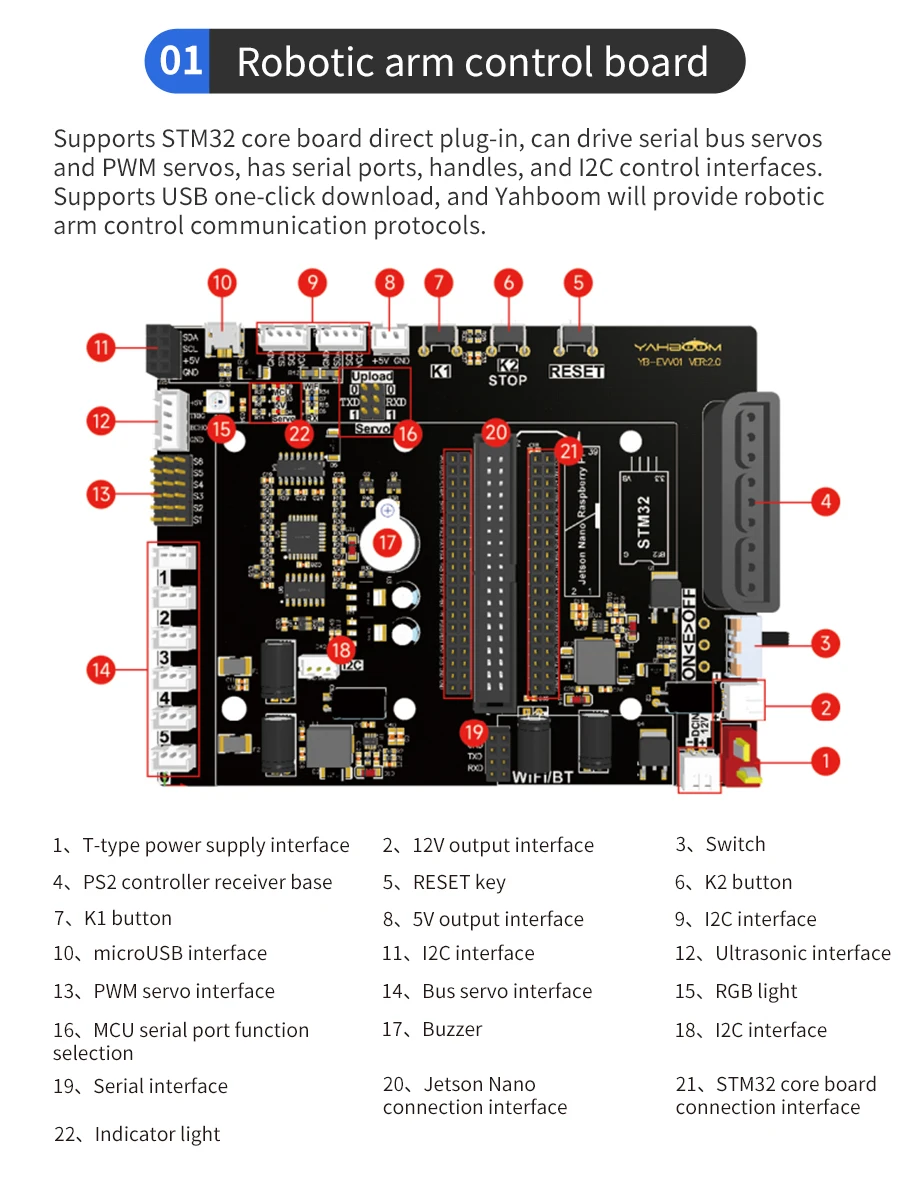 We reserve 6 bus servo (DOBFOT only uses one) + 6 PWM servo, wireless controller receiver, WiFi/Bluetooth module, I2C and ultrasonic module interfaces.