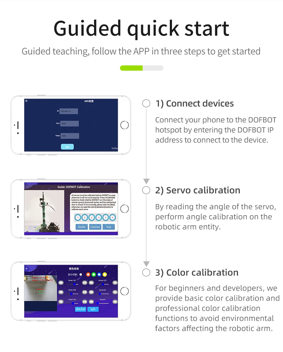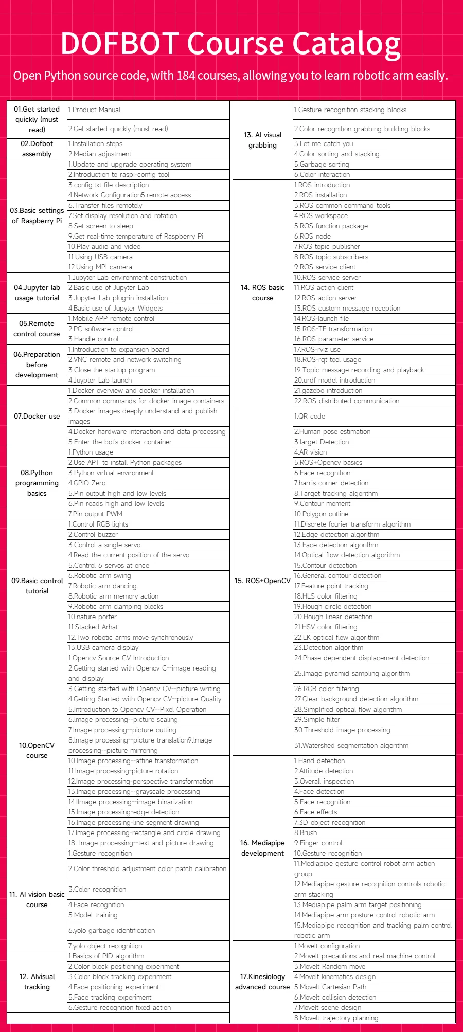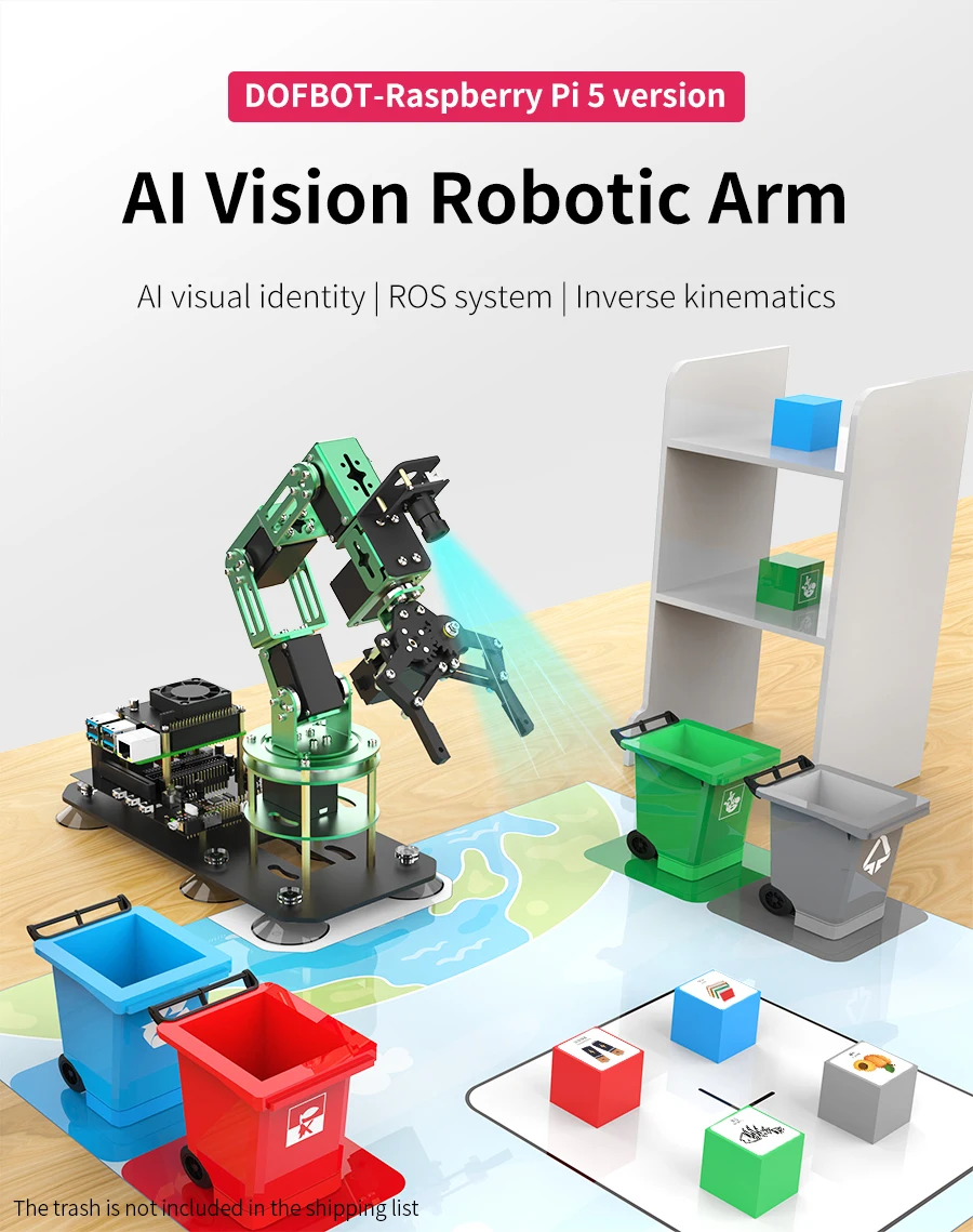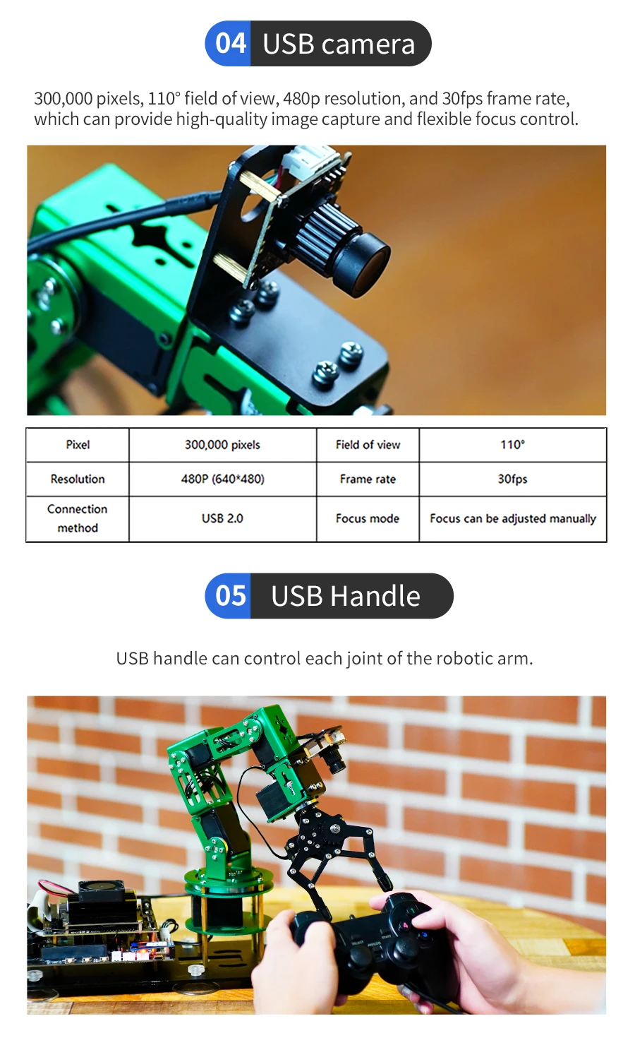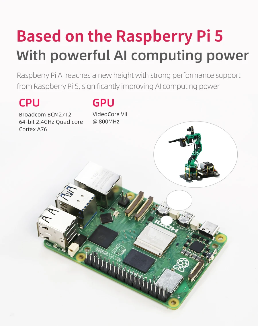 This Raspberry Pi robotic arm is mainly composed of an aluminum alloy bracket, a sturdy chassis, a multi-function expansion board, 6 bus servos and a 300,000 pixel camera. We built an operating system specifically for it based on Ubuntu20.04/ROS noetic, using Open Source CV and Python3 programming to create a series of AI vision functions. It can be controlled by APP, PC software, handle, JupyterLab. We provide detailed tutorials, open source codes and technical support services for Raspberry Pi players and AI beginners.