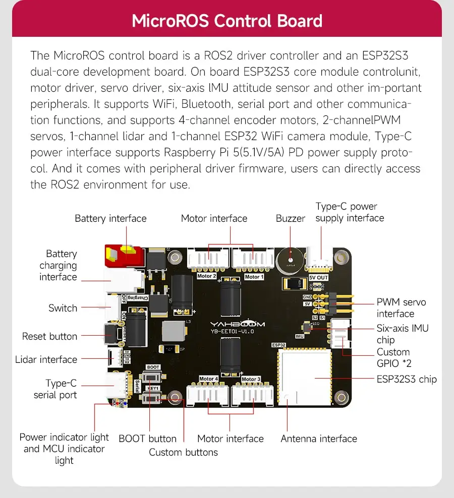 This MicroROS-Pi5 ROS2 car is developed based on Raspberry Pi 5. It consists of a Micro ROS robot expansion board with ESP32 co-processor, 4PCS 310 encoder motor, high-quality tires, 7.4V 2000mAh rechargeable battery, MS200 lidar, 2MP camera, 2DOF gimbal and an aluminum alloy frame. It adopt ROS2-HUMBLE development environment and Python3 programming, and uses OpenCV image processing and MediaPipe machine learning algorithms to achieve multiple functions such as robot motion control, AI visual interaction, SLAM mapping navigation, RViz simulation and multi-machine synchronization control. Users can control it by mobile APP, wireless controller, computer keyboard control. Yahboom will provide each customer with detailed tutorial materials, installation videos and professional technical support.