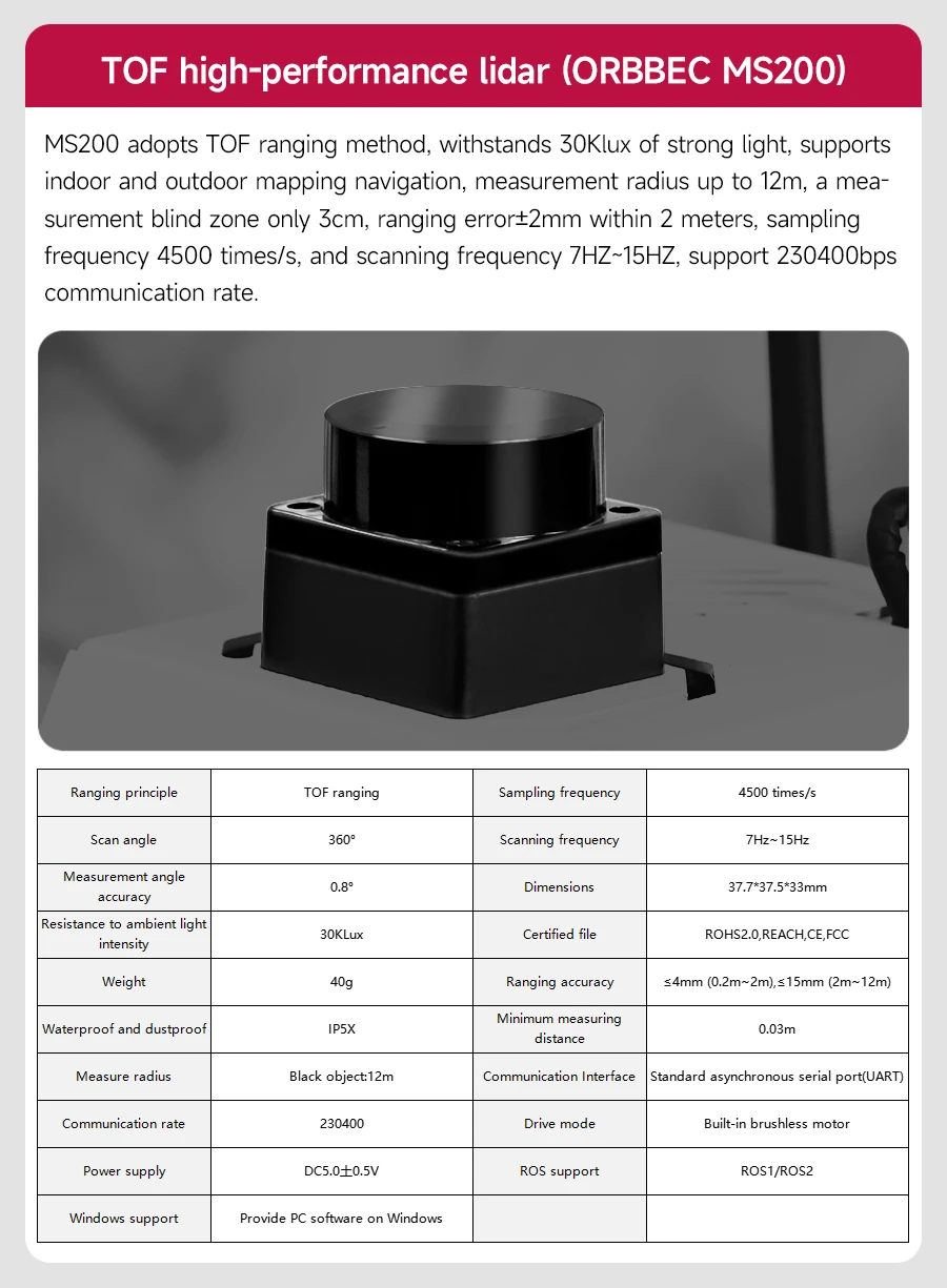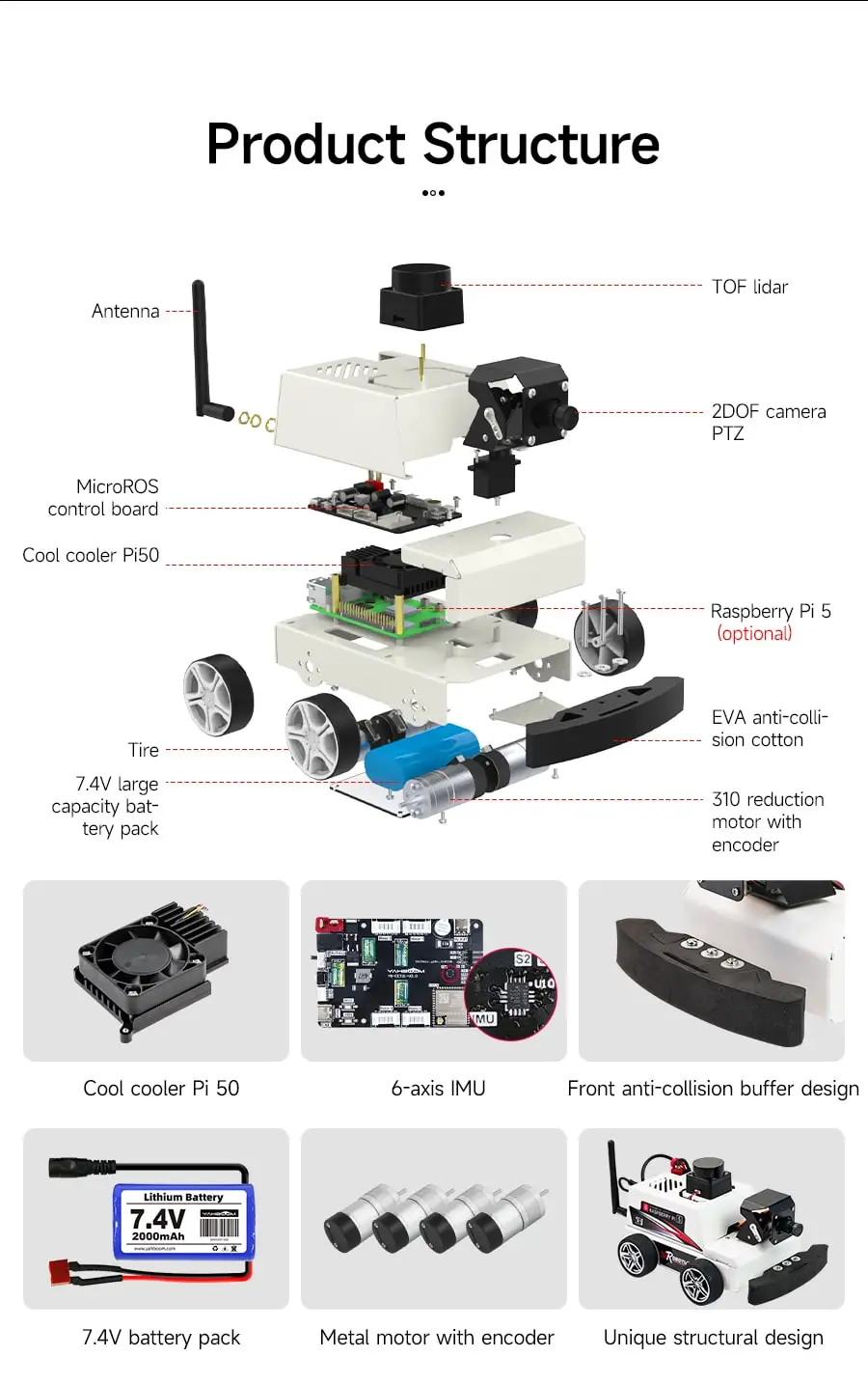 Equipped with ESP32-Micro ROS robot expansion board, 310 encoder motor, MS200 lidar, 2DOF cameraPTZ , Cool cooler Pi 50 and other hardware devices.