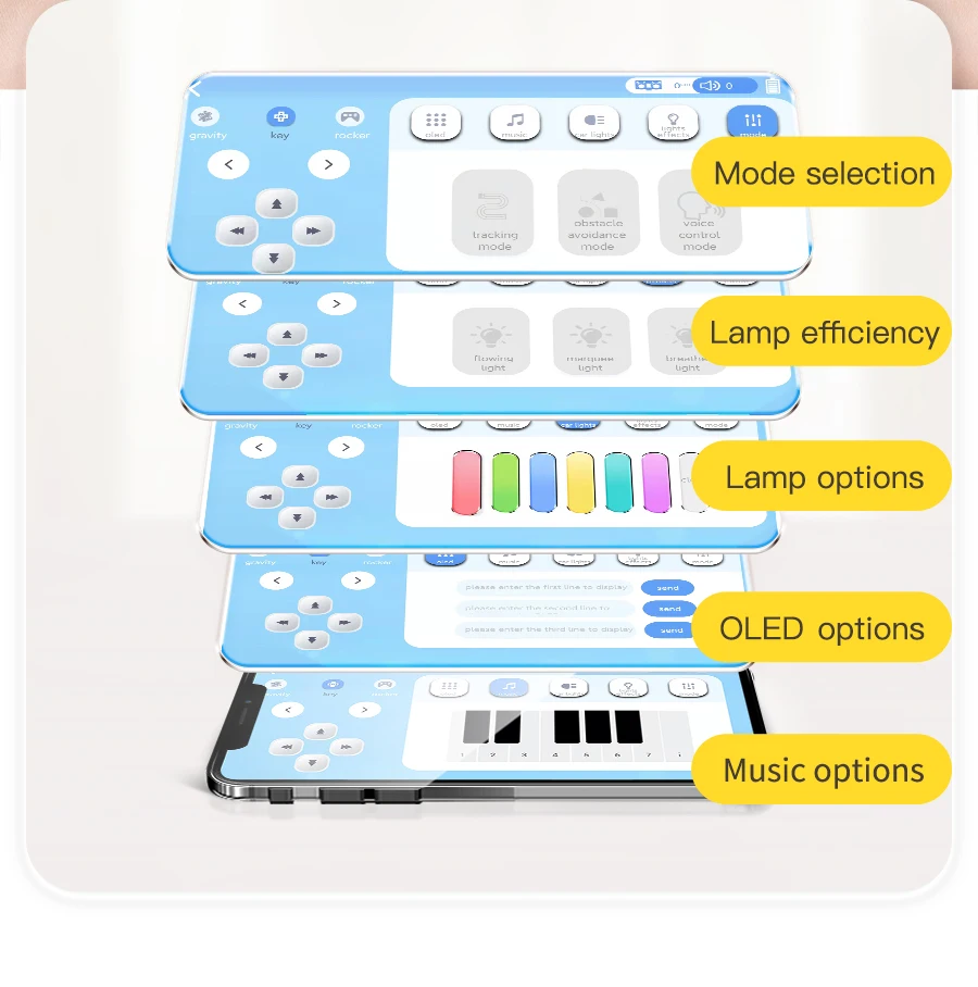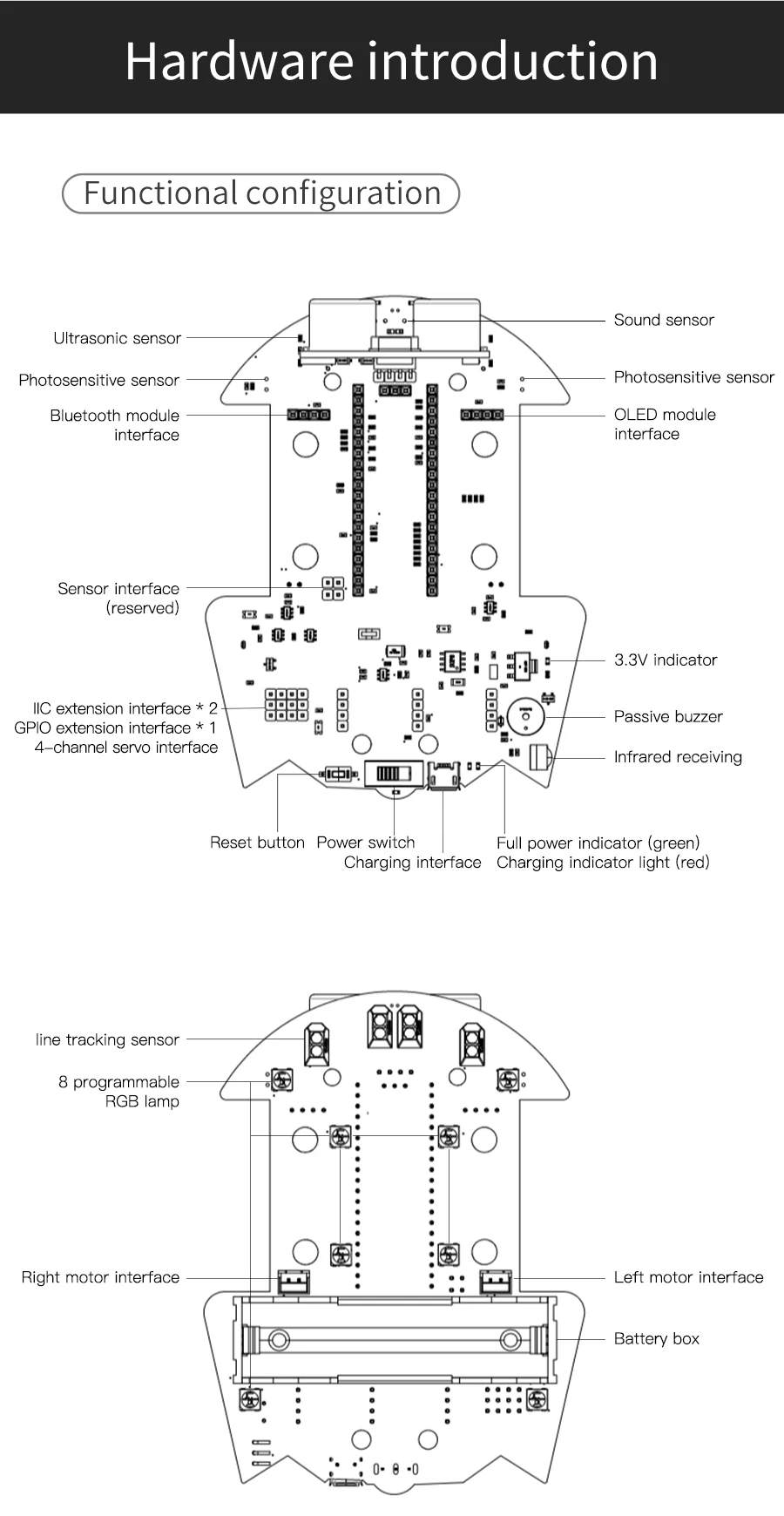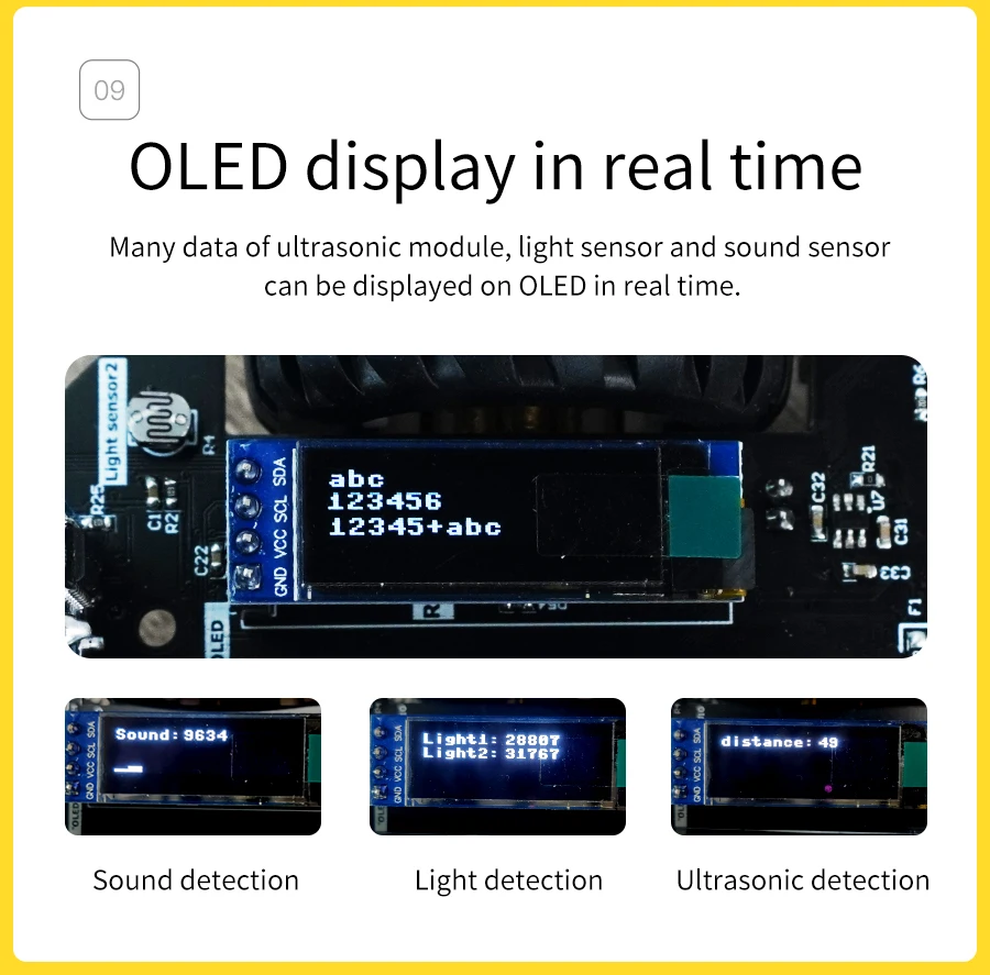 A large number of on-board resources: tracking sensor, ultrasonic, light sensor, sound sensor, buzzer, Bluetooth module, OLED display, infrared receiver.