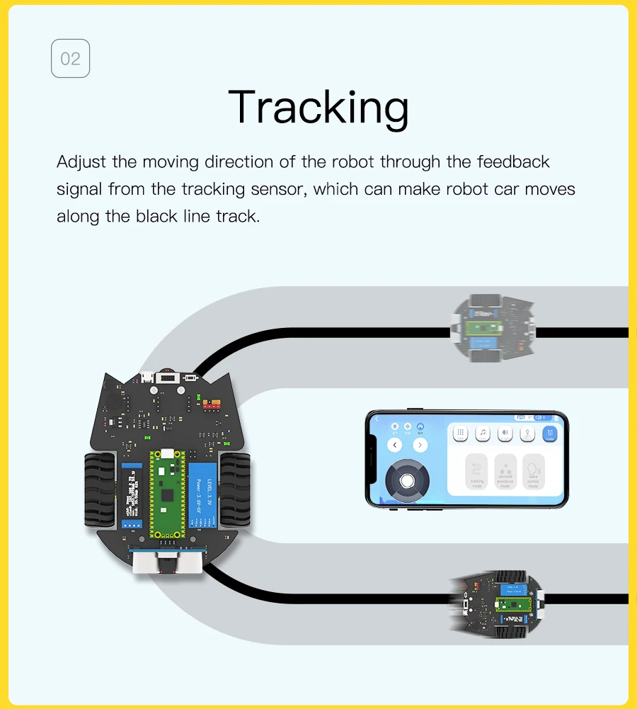 Raspberry Pi Pico robot is a compact and cost-effective educational programmable 2WD smart car. It is based on Raspberry Pi Pico, and uses the MicroPython as programming language, combined with on-board sensors, many interesting functions are realized. This robot possess an infrared receiver and a Bluetooth module, so the user can remotely control it through the infrared remote control or mobile phone APP. We reserve the servo interface, IIC interface, and common pins on the expansion board, which is convenient for users to expand more functions. In addition, we will provide a large number of tutorials and source codes. All in all, this is a good platform for programming beginners, programming education institutions or primary education.