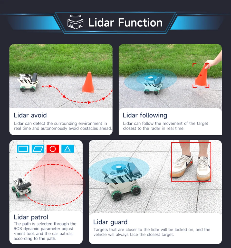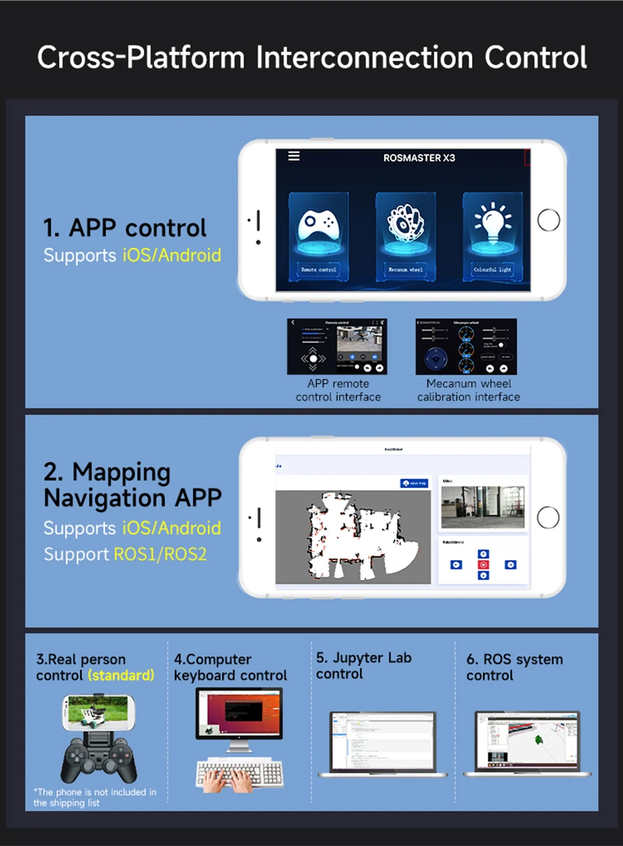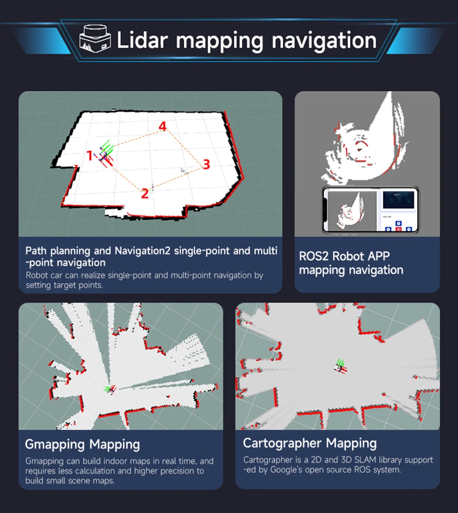 Users can control the car through mobile phone APP, PS2 controller, computer keyboard, and ROS operating system. And we have also specially developed a mapping navigation APP for it, so that user can realize mapping navigation anytime.