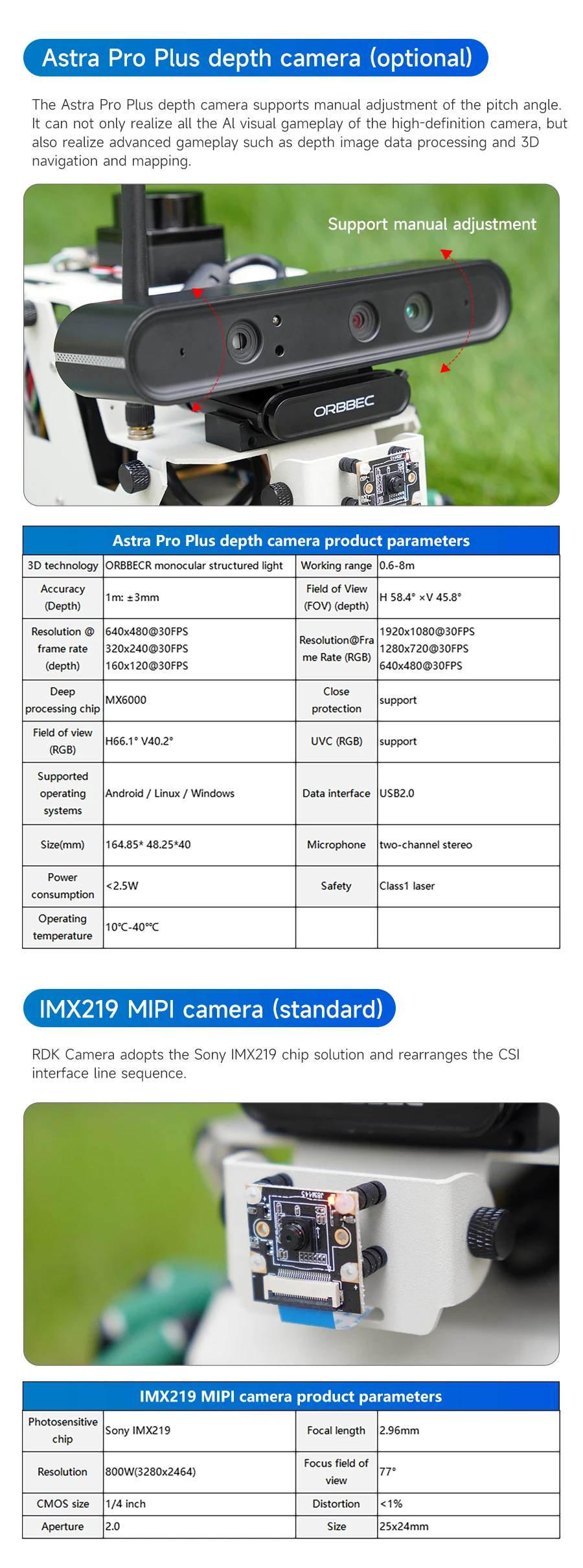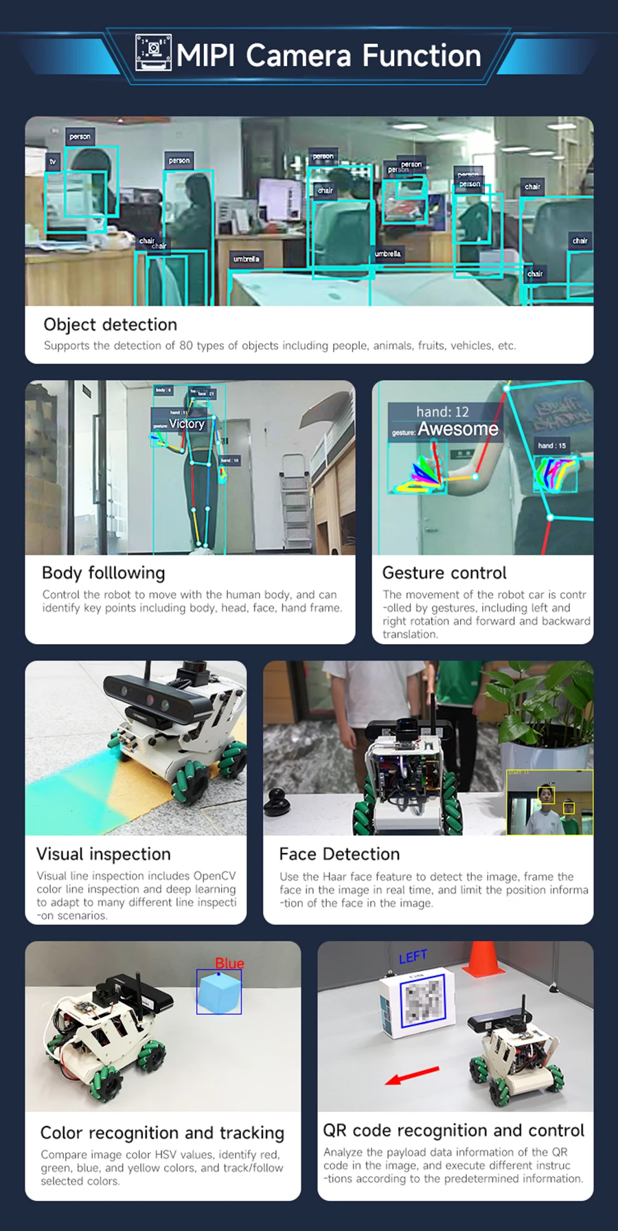 •RDK X3 development board is equipped with the ROS2 operating system, which endows this AI vision car with excellent functions and mobility. RDK X3 robot car is designed with Mecanum wheels, so it can move flexibly and freely in various environments. Its combination of depth camera and lidar enables it to accurately identify and track targets, and realize intelligent navigation and obstacle avoidance functions. Through Jupyter Lab Python programming and deep learning algorithms, the car can identify, classify and analyze the surrounding scenery in real time, so as to achieve a higher level of intelligent decision-making and interaction.